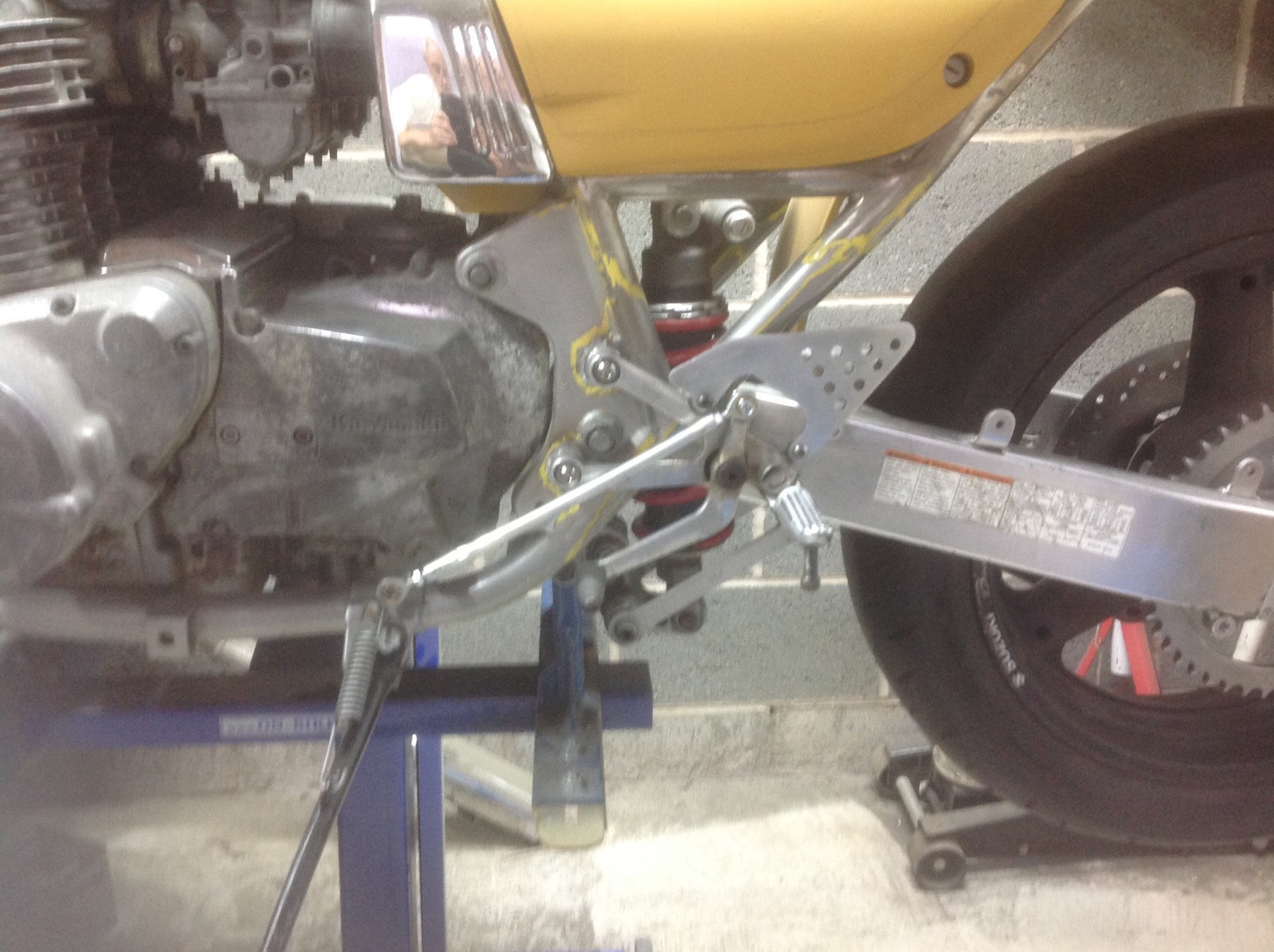 The two brackets just bolt to the "stand bobbins" on the GSXR swingarm. I then cut a spare Bandit axle to the same width as the wheel assembly so that I can fully assembly the back wheel on the floor (calliper, spacers etc) with the "assembly shaft installed.