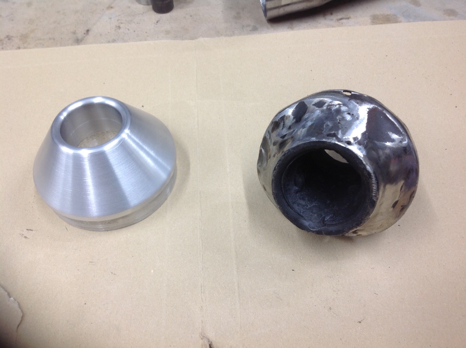 Well after last weekends frustration finding the exhaust collector had rotted out I decided to be prgamatic about the whole situation. On inspection the rest of the collector was pitted but solid so the rebuild began. Once the collector was done I moved onto the end can which wasn't in great shape under the badge either, no worries I replaced the body of the can and at the same time extended it a couple of inches by welding the new section to the taper of the original. Now the end cap was looking pretty shabby so, inspired by Howard's build I set to turning a new end cap in alloy (I think this billet was about the upper limit for my little lathe and took some lateral thinking) the billet wouldn't fit in the chuck of my lathe so I made a 12mm arbour screwed into the middle of it, once the back side was hollowed out I could be.t in the chuck once I flipped it around. Still a way to go but I am really happy with the results so far. Just the intermediate pipe and the headers to sort now