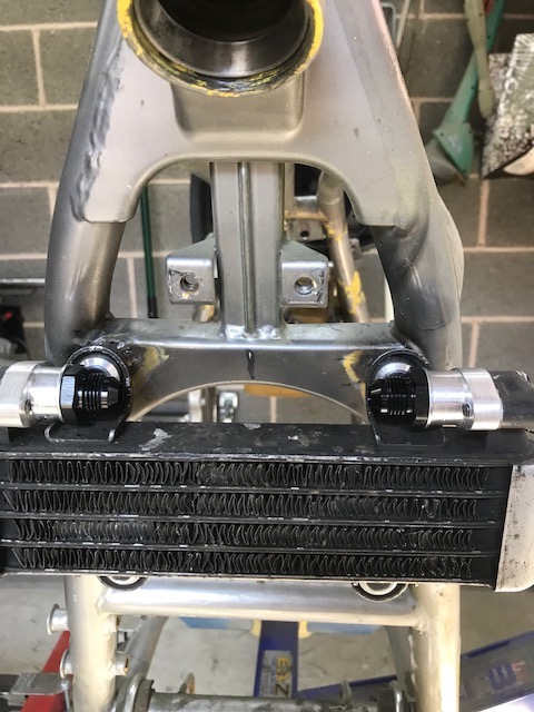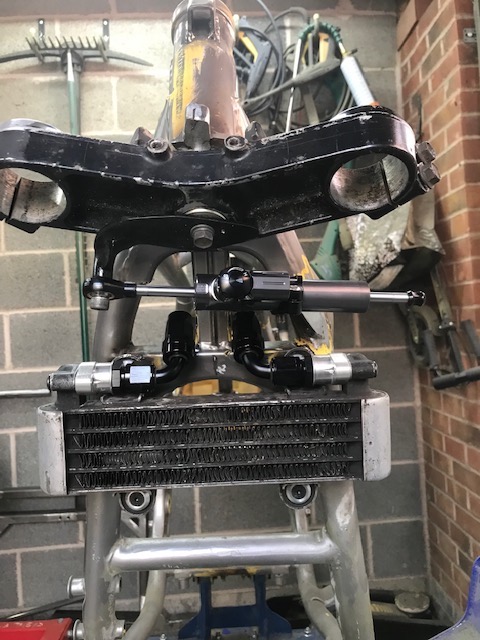 18 May 2024 15:26I'm pretty sure with the horn mounts removed (using for the damper currently) it will be OK, I have some 90 degree fittings that will attach to the adaptorsI was asking because there's not a lot of room in there even with the cooler high against the steering head.
