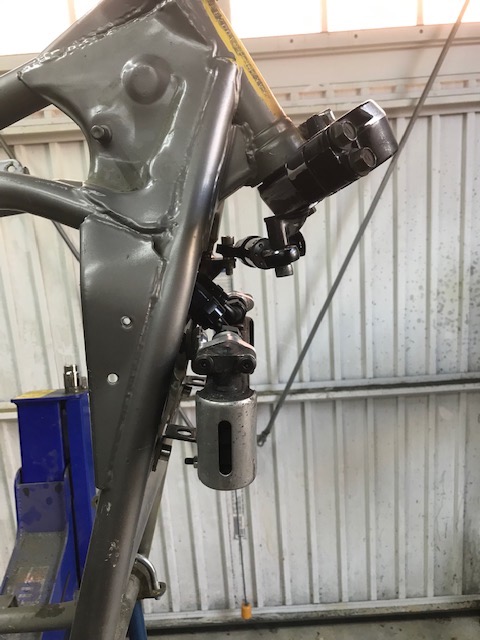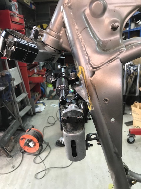 cutting the horn mounts off the frame gave me the clearance for the hoses (just) and with a new damper mount welded to the downtube we are back in business