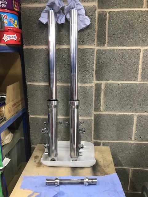) I have added an extra 35cc of oil in each to take account of the increased air gap with the extensions. Also made a start on the lower tree, I've got all the old paint off (will be painted again) but I like to remove the casting "flashes" not necessary but I think it makes a cheap OE part look much nicer