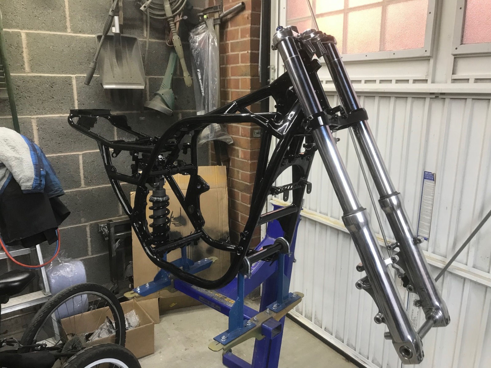 This project has really "turned a corner" this weekend and is finally looking less like a pile of parts. Rear shock is cleaned & reassembled with a freshly coated spring and lower cap and sitting in it's final resting place. Oil catch can and starter solenoid are on, as is the front end. Really glad now I spent the time on the frame, it's not perfect but it's no "show pony" and I'm more than satisfied.