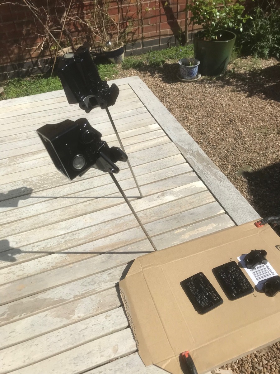 It's been another weekend of refurbishing cheap parts from Ebay, the ZRX master cylinders have been stripped, cleaned, the old paint removed and re-painted in black enamel. Just need to wait a few days for it to fully cure before I handle them to re-assemble.