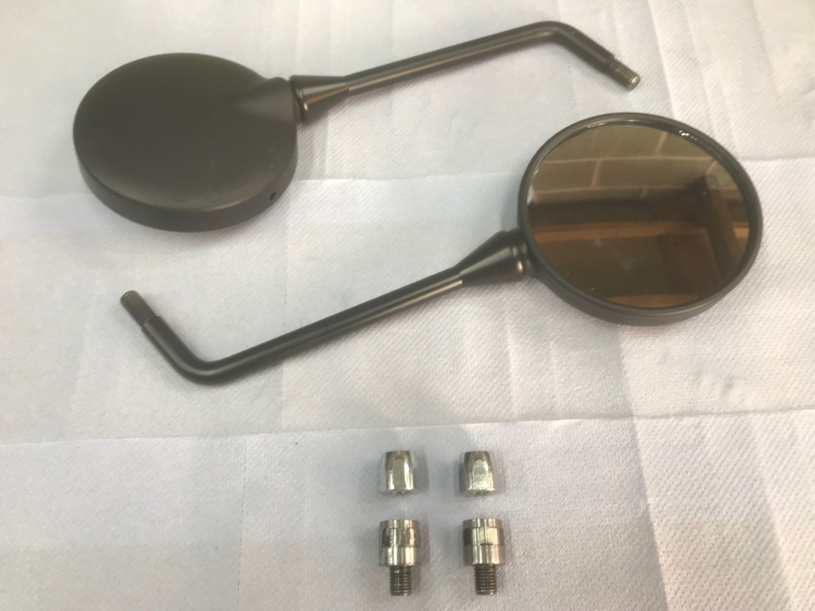 Next was my mirrors, I wanted to use OEM mirrors as I don't like any of the aftermarket stuff I have seen (don't want "Maltese crosses" or "space ship mirrors" !!!) I have been watching out for a set of Z900RS units as I like the look and they don't stick up like "Micky Mouse's" ears. However I have been watching for ages and nothing came up until recently (remember I'm "cheap") these looked in good shape with the exception of the butchered fittings and missing rubber/plastic covers so I threw in a cheeky bid