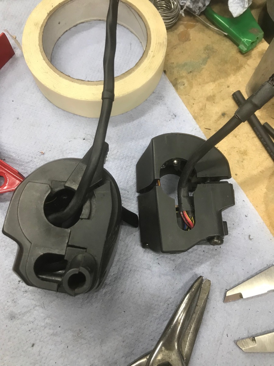 Had a change of pace this weekend with some "electrical". The main functions of the switchgear run through a Axel Joost "D-Box" which means that the handlebar switches are only switching ground signals at approx 0.25amps each. This means I can run much lighter cables (22awg) and less of them. After re-configuring the internal wiring the left switch now has 5 wires instead of twelve and the right 5 instead of 10