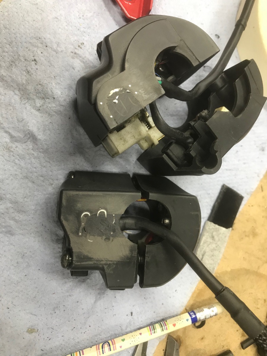 I wanted to run the wiring internal for a cleaner look so with the now format I only needed 7mm holes in the bars and risers (wiring runs through the risers) This left big ugly exit holes in the housings for the original wiring, these have been closed with some blanks cut from ABS sheet and "hot staples" a little filler primer and a coat of textured black "Voila"
