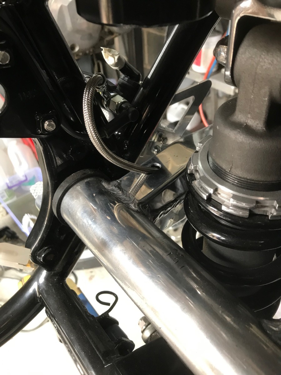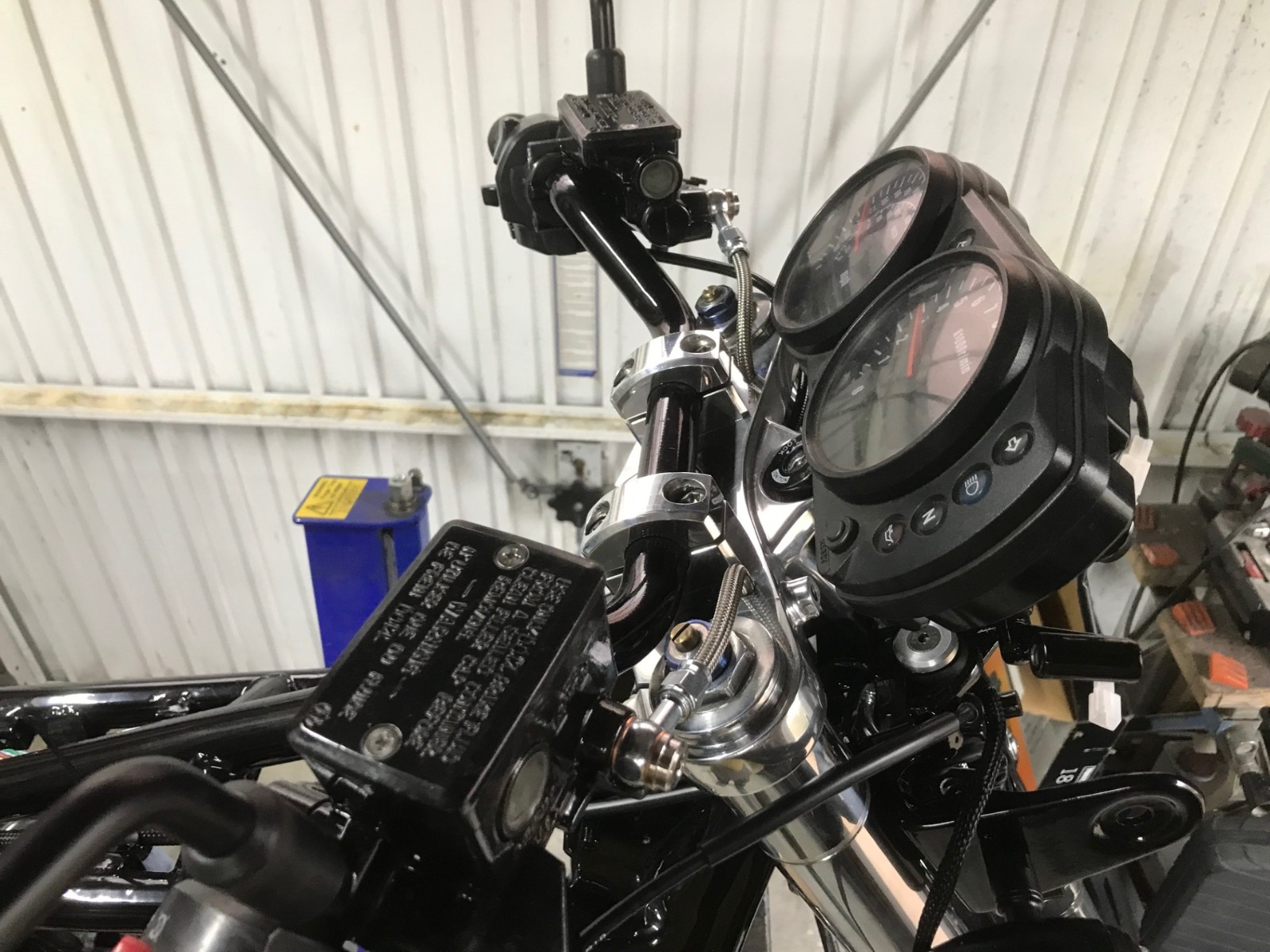 pretty much wrapped up the handlebar furniture (still need to fit new grips) and the front end wiring is in (the clocks are away now to have the odometer re-set to zero) also got the front end hydraulics in (ran out of time for the rear and it will be a fiddle as the hose runs through the swingarm) Was a bit of a PITA making the hoses on the bike but that was determined by the routing (why do things the easy way !!!) also need to sort some clips for the front hoses to keep them off the fender