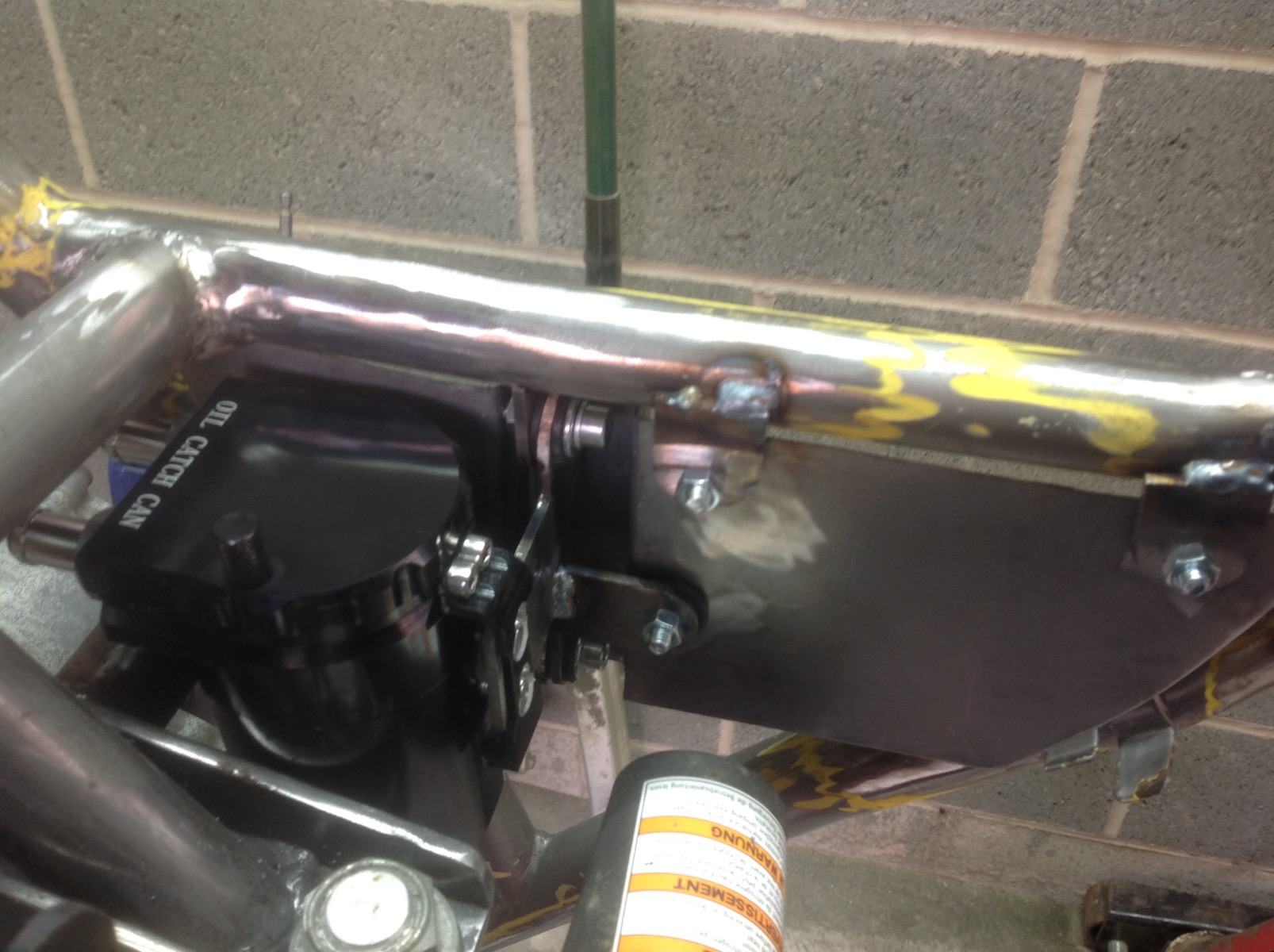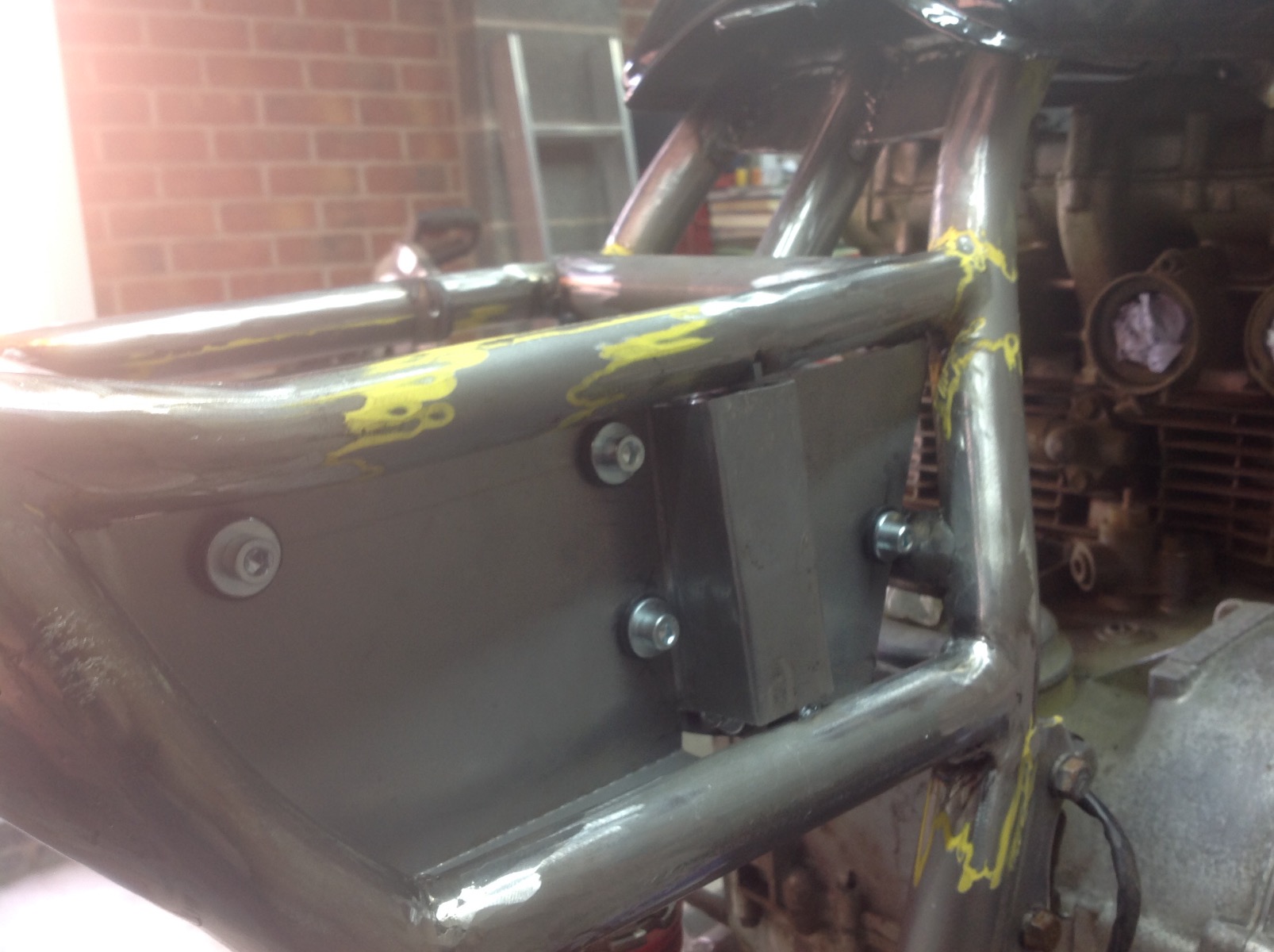 I find this stuff heavy going as I'm no fabricator (I'm too cheap to pay somebody else to do it) but it needs doing and the fun stuff should be just around the corner. Have re done the rear fuse box mounts as I didn't like the first attempt, finished the mounts for the left inner side panel, fitted a rail to carry the wiring harness, made the right inner side panel (this was a PITA as it had to go round the catch tank mount) and finished the mounts for that side too ( don't worry about the welding, I will go over everything and finish weld the tacks when it is stripped down to a bare frame)