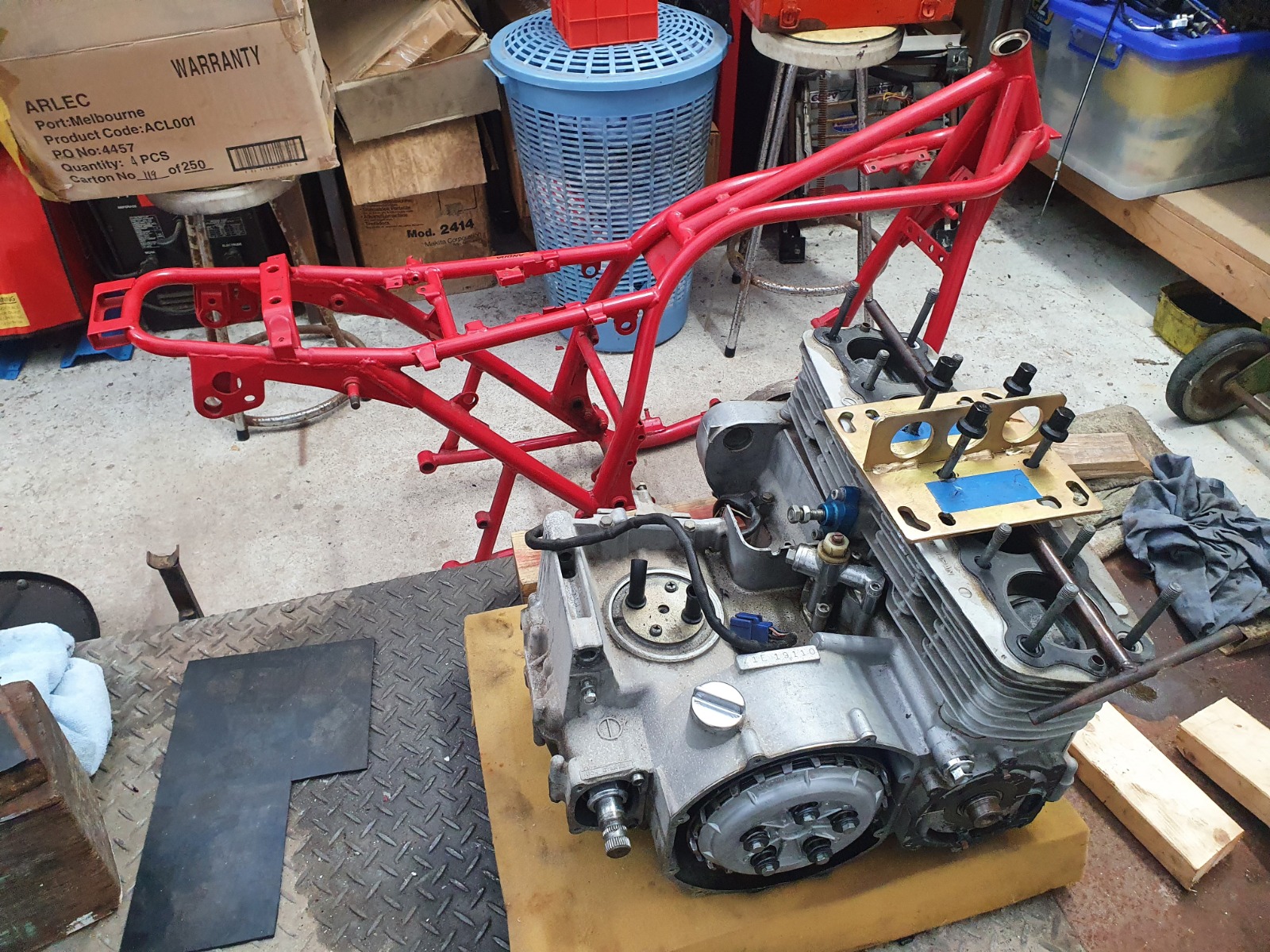 The engine is out of the frame, we hooked up the engine hoist and lifted it enough to separate the engine from the frame (took a bit of jiggling) and then pull the frame away to the left.