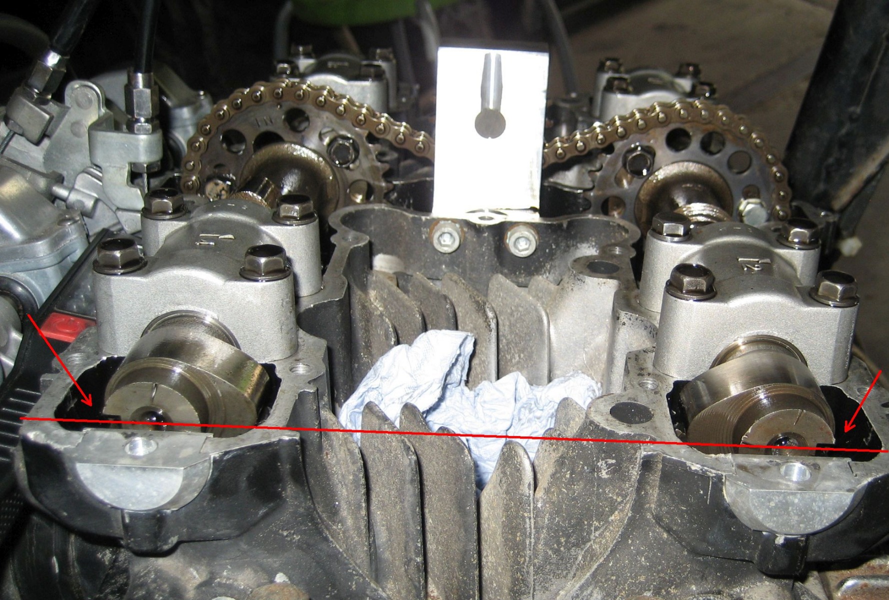 For a second reference point, the middle of both notches on the IN/EX cams should be parallel as possible to the gasket surface at TDC.
