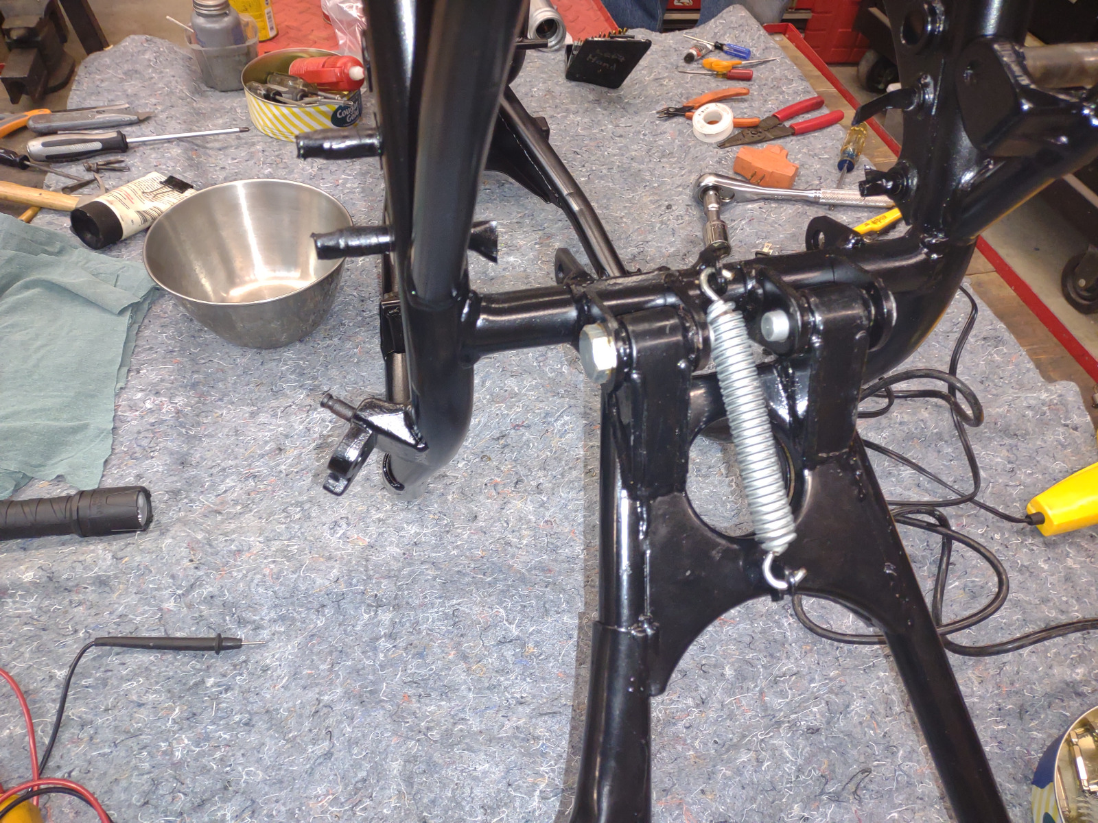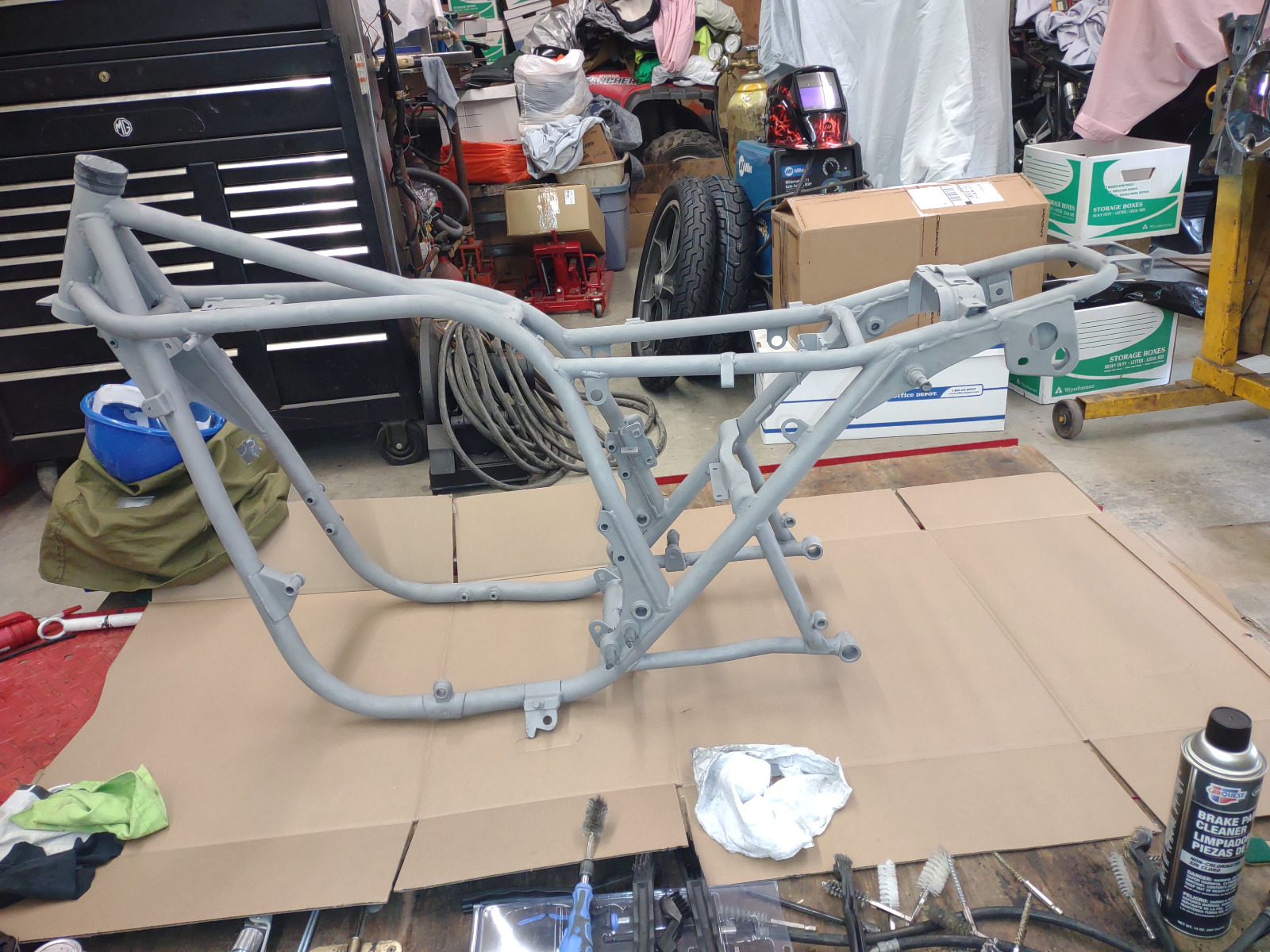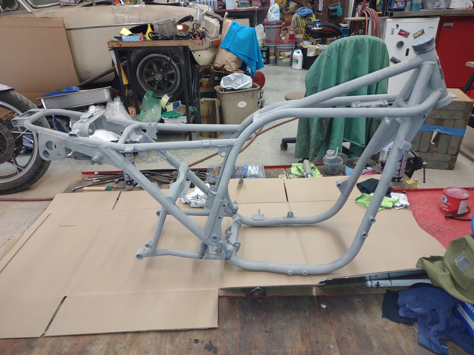 Yesterday we put the painted frame on the lift and cleaned out the threaded holes. Currently working on finding a centerstand so we can start assembly.