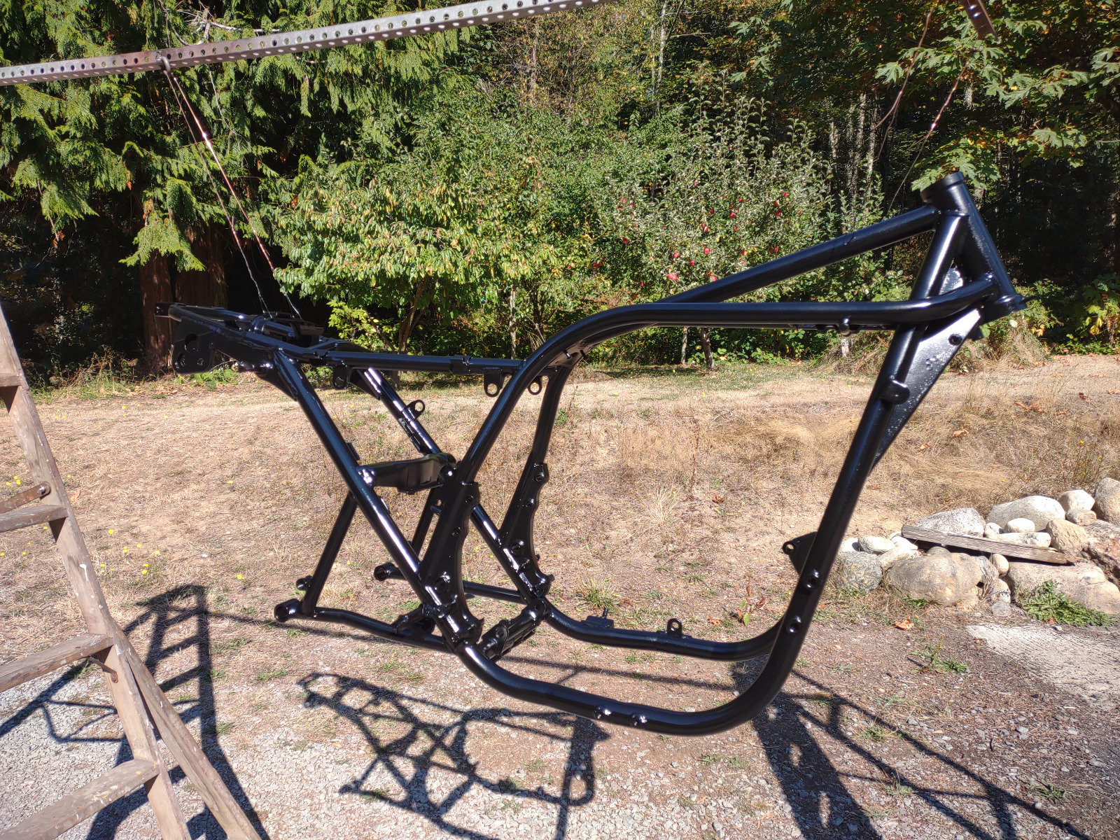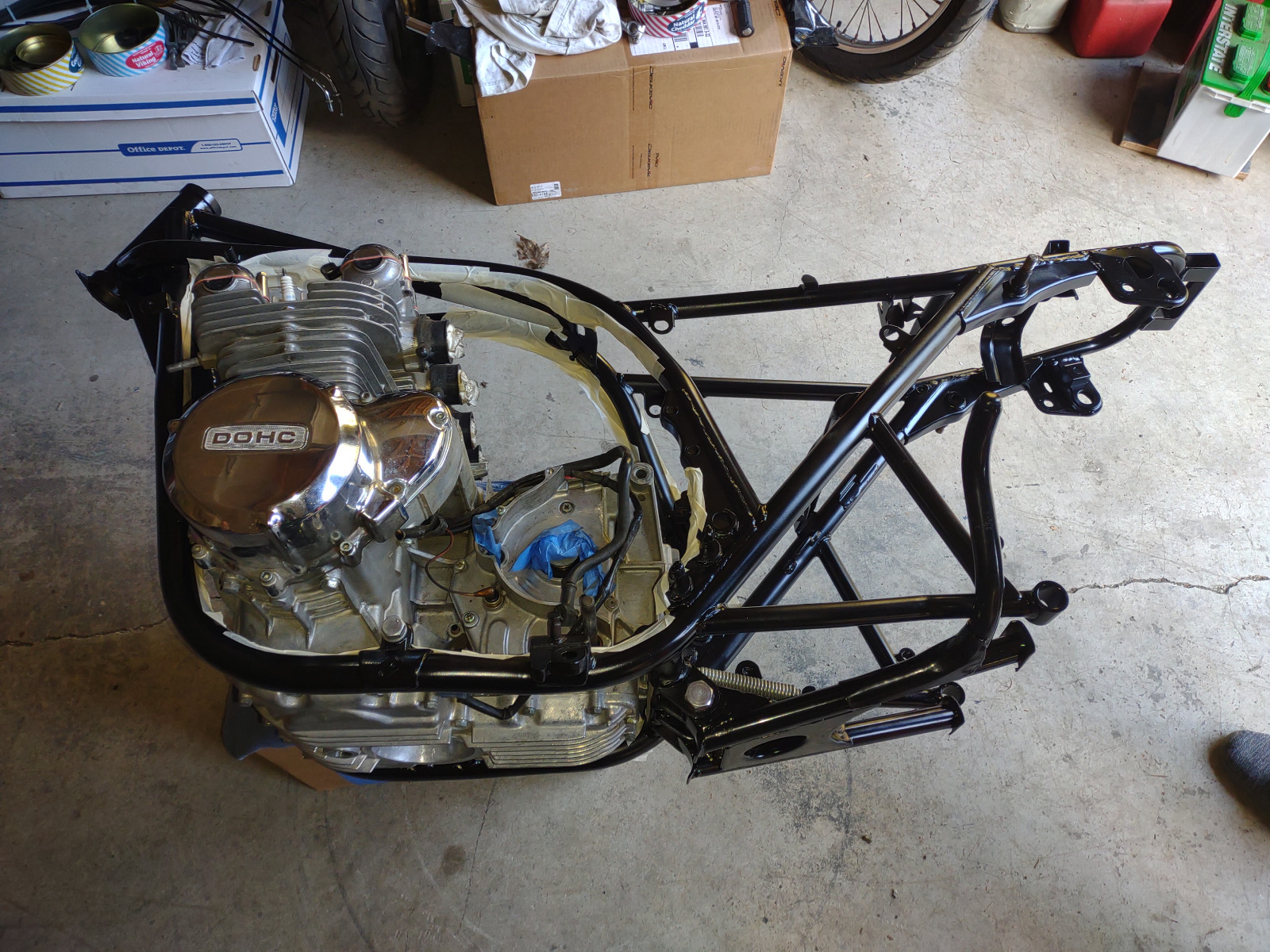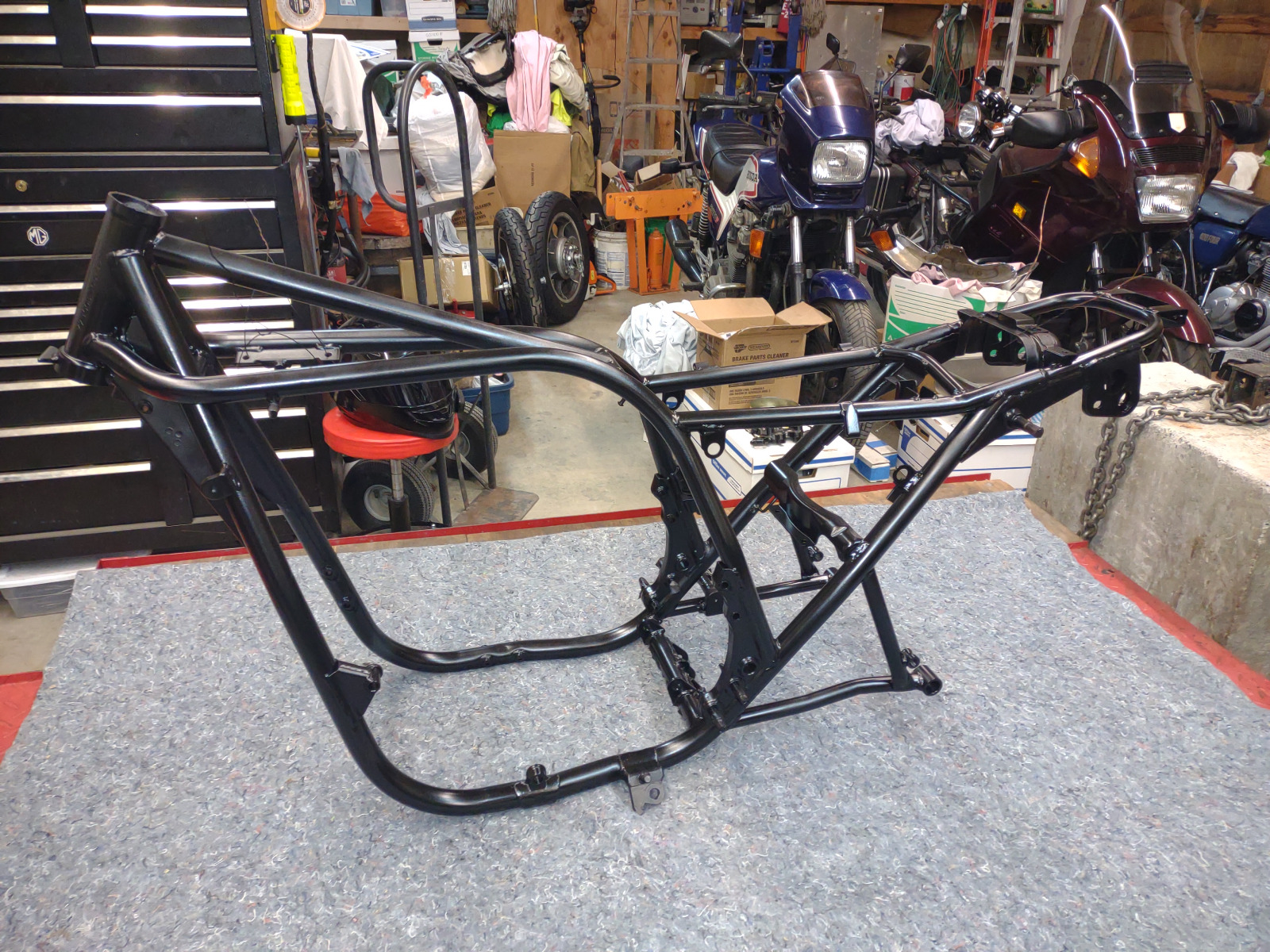 Yesterday we put the painted frame on the lift and cleaned out the threaded holes. Currently working on finding a centerstand so we can start assembly.