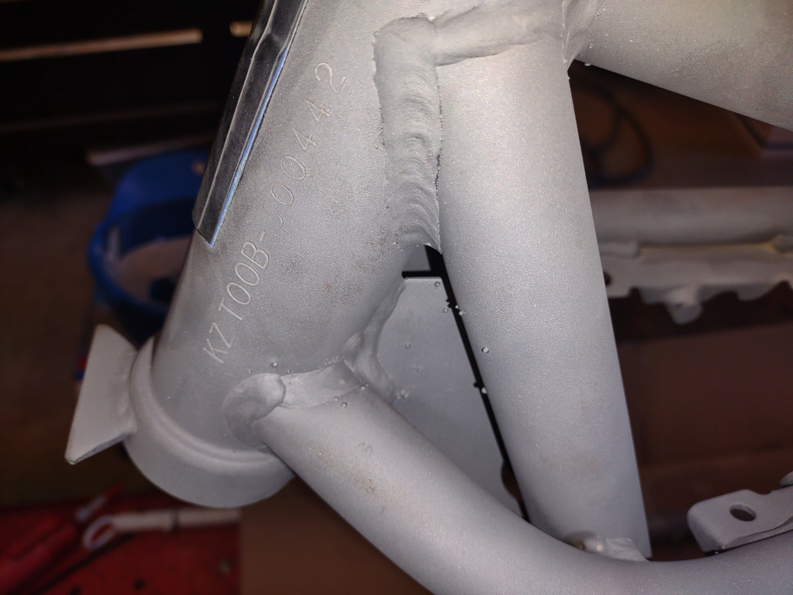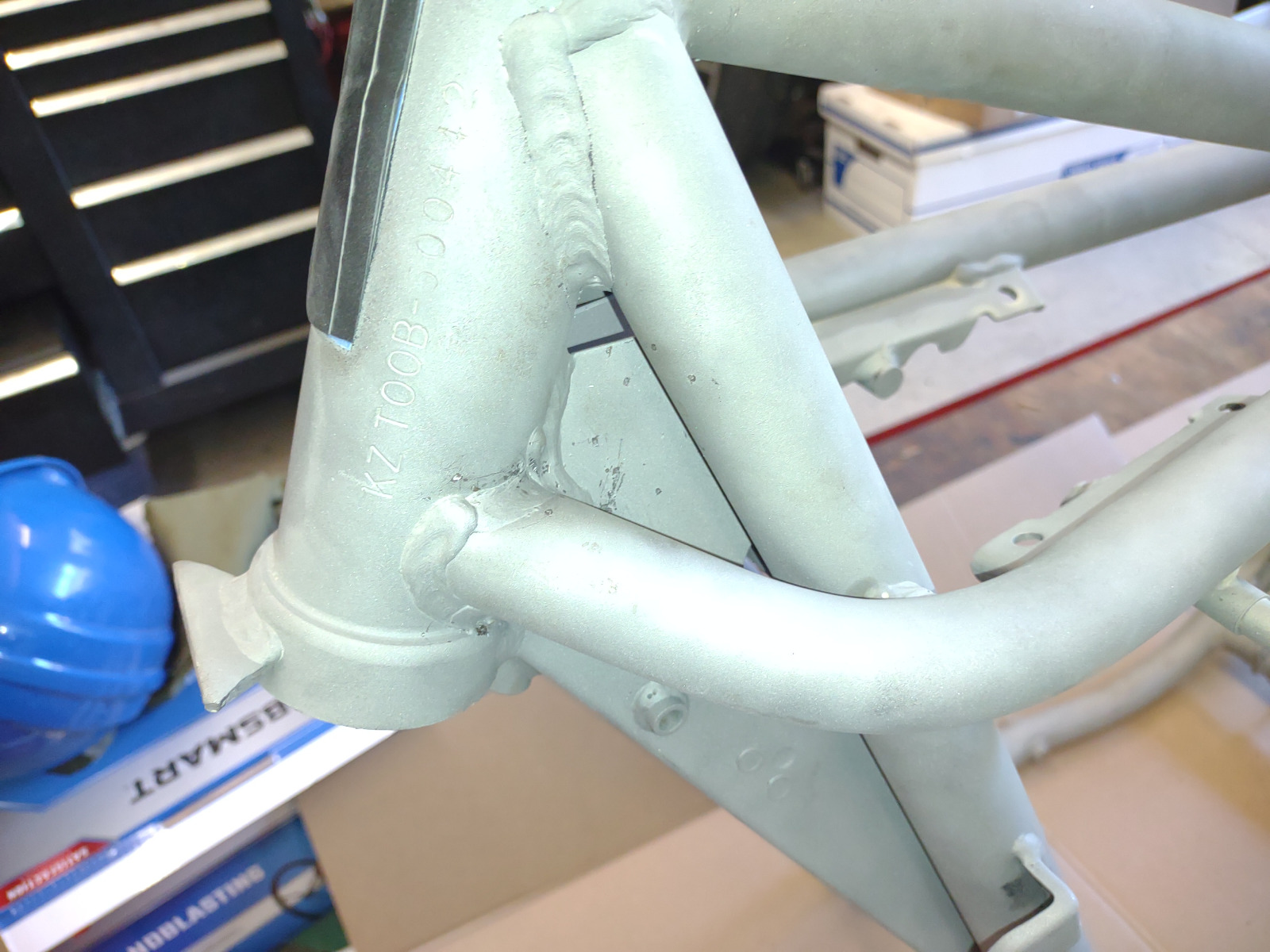 Today I removed the welding spatter from the frame and swingarm. I use a small hammer and a 3/16" punch. Set the punch against the side of the spatter bead and hit the punch with a light sharp strike and the bead pops off. Once painted it looks so much better plus it doesn't tear up the sandpaper while prepping for paint.