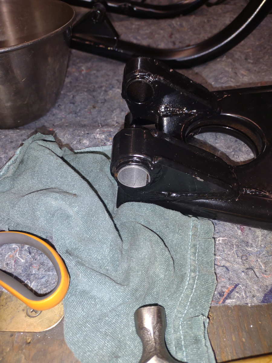 We got the new centerstand mounted satisfactorily by shimming the bores with strips of aluminum sheet so it doesn't rattle while riding. Now we can put the frame on the motor and stand it on the lift table so we can put the rest of it together.
