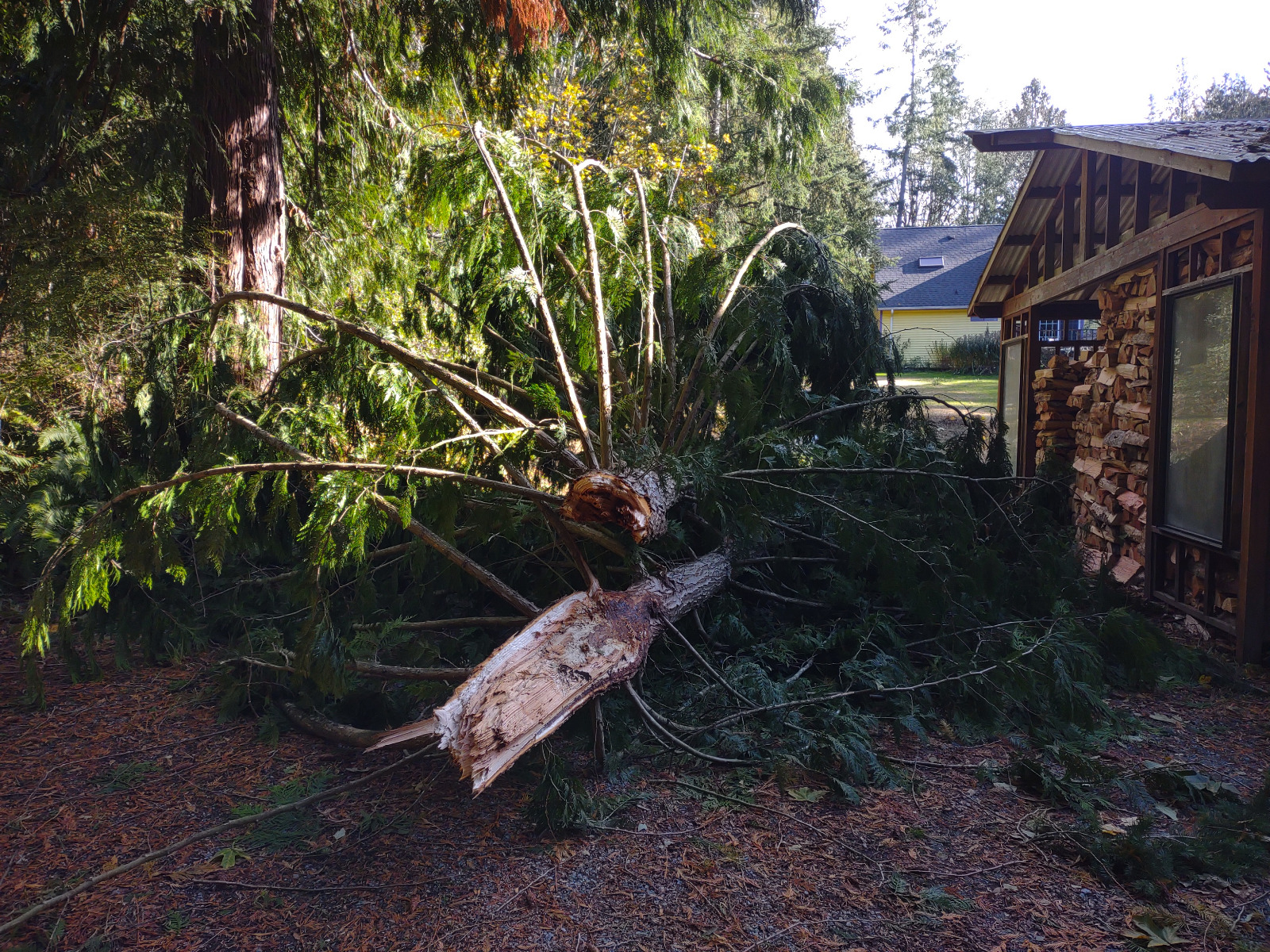 The top half of a large cedar tree just missed the woodshed but that's okay because I needed some more kindling wood.