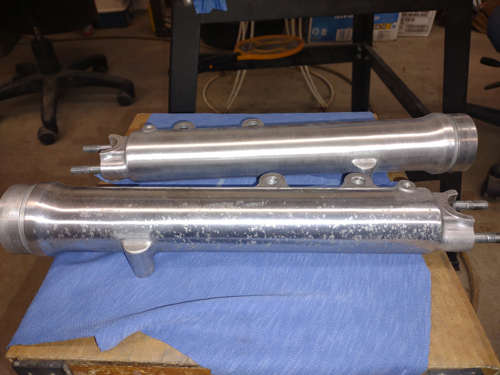 We started installing the wiring harness after some repairs. We also installed the swingarm and shocks today.I have been cleaning up the fork lowers after stripping off the clear coating with a brake fluid bath. I'll be giving them a satin finish with 400g and using only sanding strokes around them, not lengthwise. I also smooth out any casting ribs and rough sandcast texture before sanding.