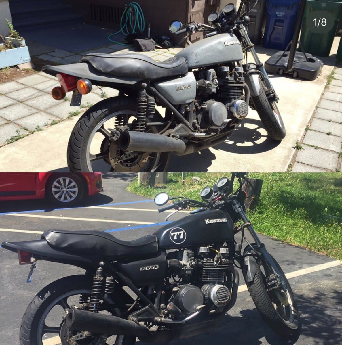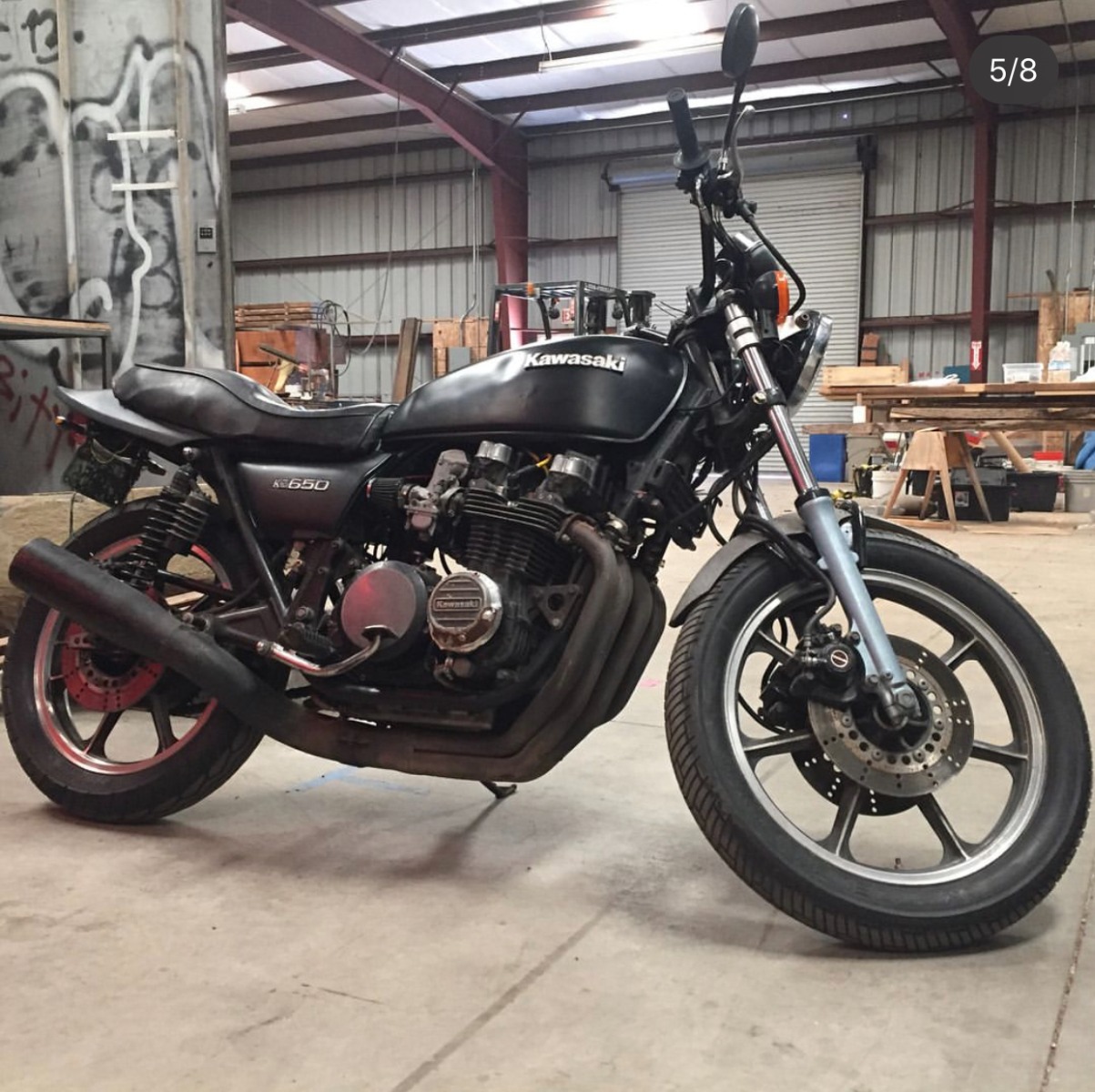 I've got a 1979 KZ650B with a 1982 KZ750E3 engine. The carbs are Mikuni VM29mm Smoothbores fit with K&N pod filters and an old school Kirker 4-1 exhaust. This thing is fit with an oil cooler from an old Honda Nighthawk. It has the 19" front rim and the 18" rear. Dual disk brakes up front, disk in the back. Otherwise has been relatively stock up to this point.