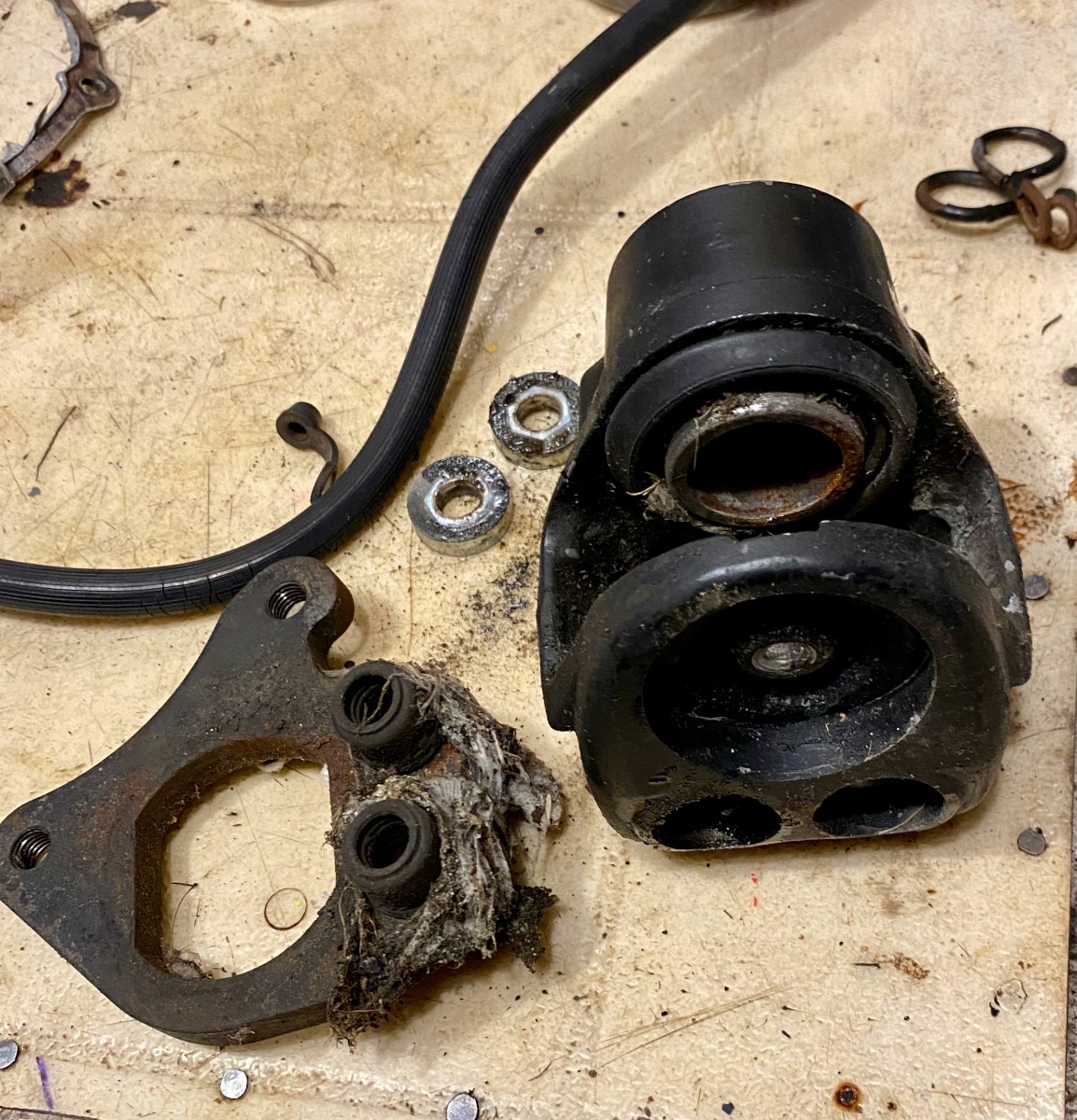 I started with the brakes, which is my habit, just to make sure she's safe if it ever rolls at speed.The rubber brake lines certainly need replacement and those little friction pads in the front calipers don't have much "meat" left.