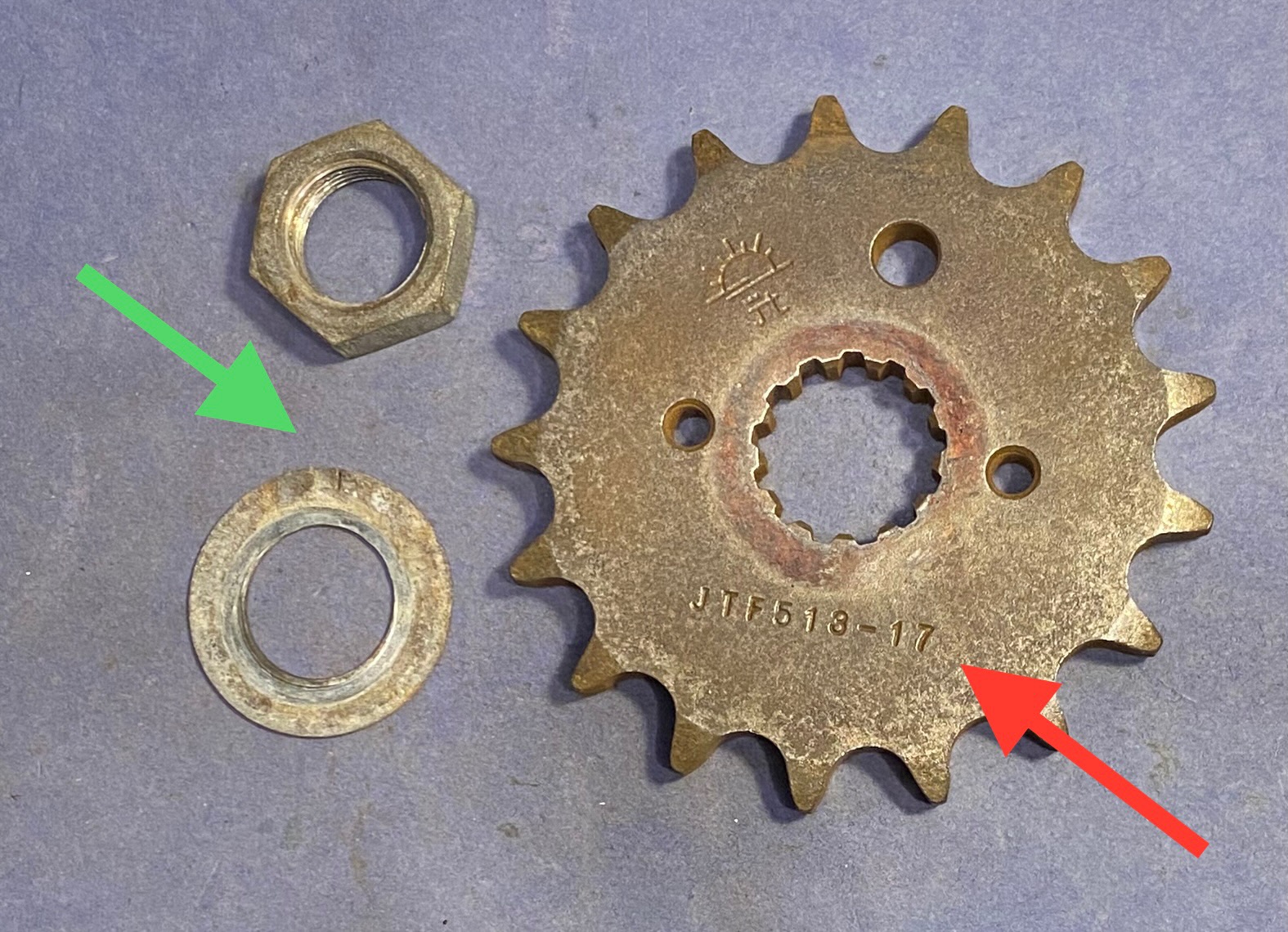 Cleaned up the front sprocket a bit, and it's a 17T 530 for sure, and with the 41T rear is a bit higher ratio than I'd like. So maybe a 37 or 38T rear. The washer looks like it has a tab to bend over, but I cannot tell where this tab would locate. See green arrow.