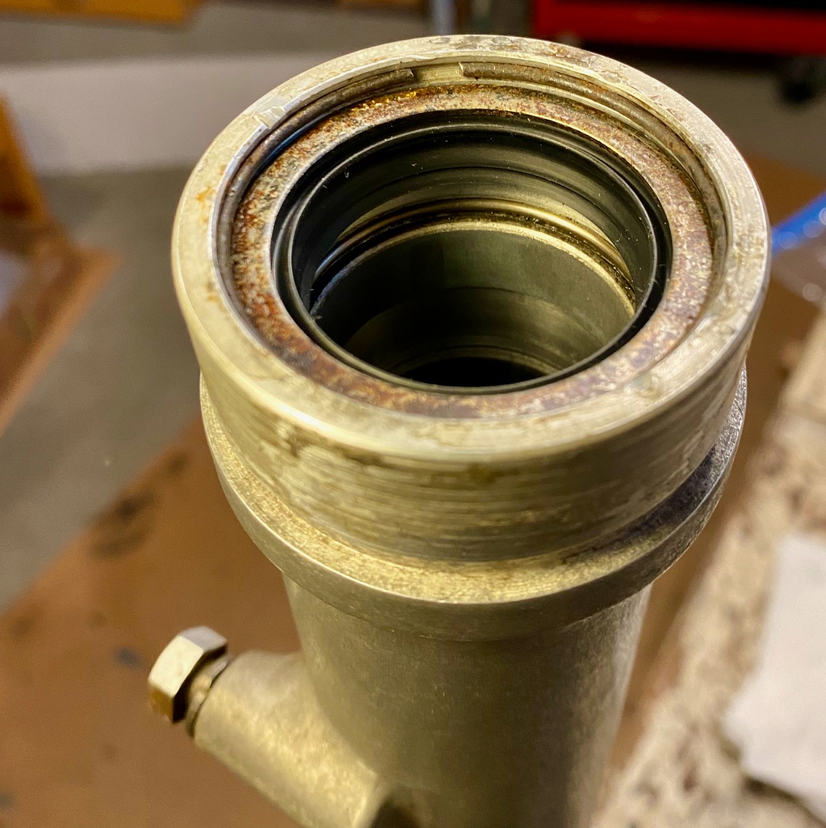 Disassembly of the forks was interesting. The left fork cap was about hand tight. The right fork cap required my 1/2" impact and a propane torch atop the tube, which fortunately came out with the threads intact.