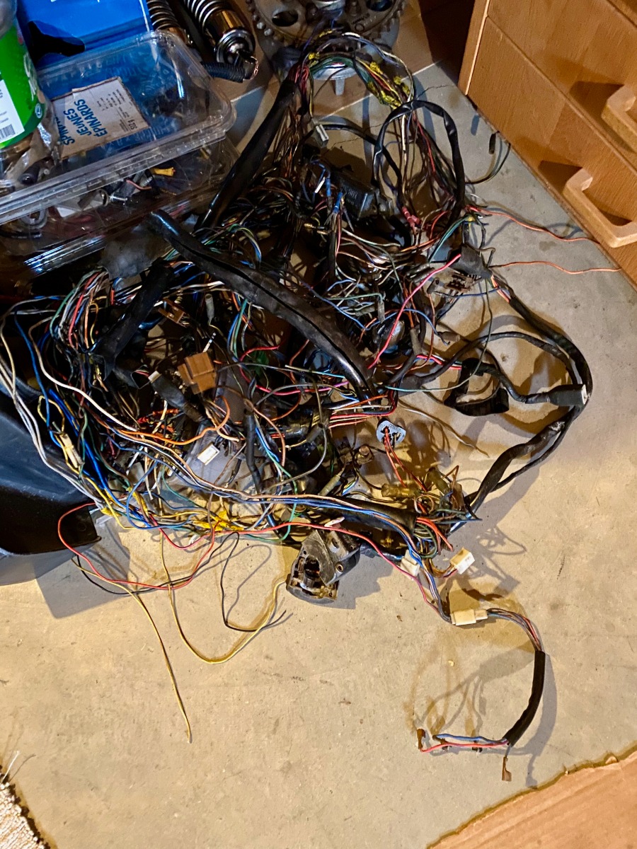 A bare chassis with engine sits on a jack in my unheated garage, so it might be time to sort out some wiring. Look at this rat's nest sitting on my basement floor!! The PO was upfront about the cut and pull method by which the wiring was pruned from the bike..