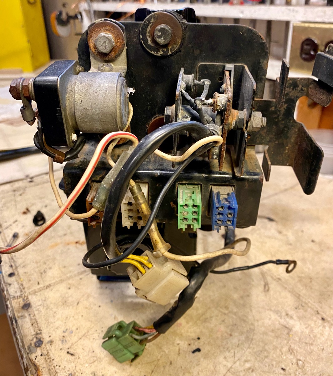 A a first step, that battery box is a bit of a wiring nerve center, so I took it to bits, then cleaned things up, and put it back together. I did test that the starter solenoid works with a good solid clack, but don't know how to bench test the rectifier or the voltage regulator.