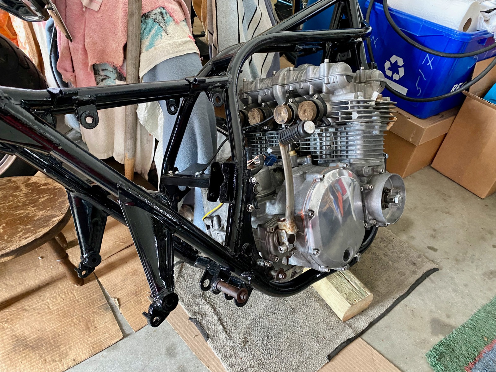It'll take some careful planning on the best way to to build her up onto the wheels. Perhaps the swing arm next, then the forks.