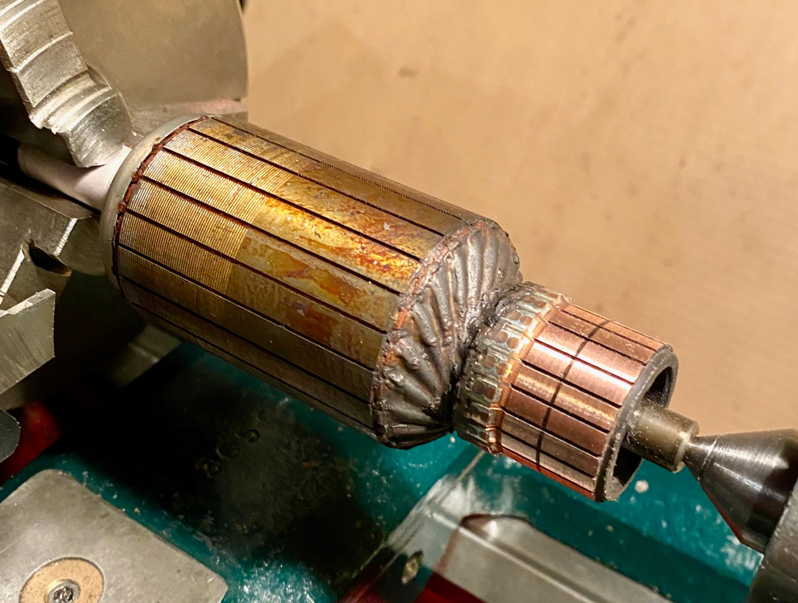 Cleaned up the commutator, and there seems to be a small "wound" on it, but only about a thou deep, which can be seen on the working brush faces (red arrow).