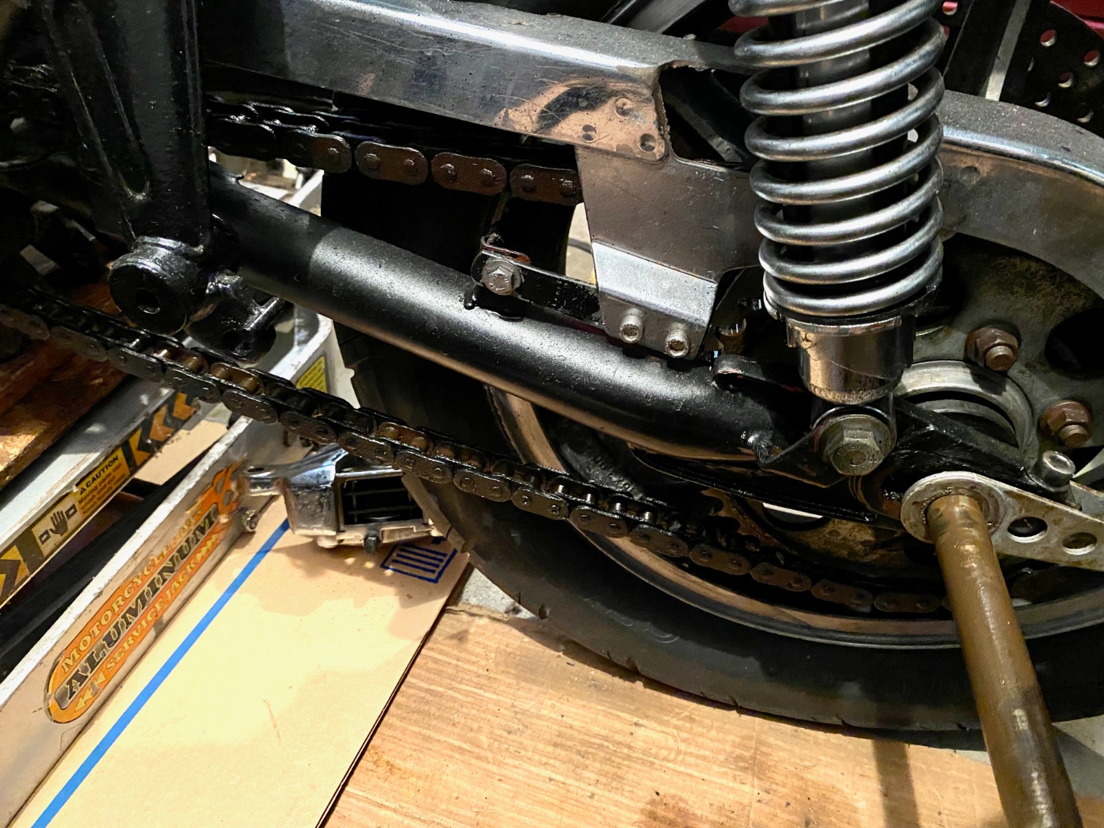 Good point about the rear shock and chain interference. The Showa shocks were both set to the highest preload which ramps those bottom adjustment collars upward. And perhaps this was done by the PO to clear the chain rather than tune the suspension.