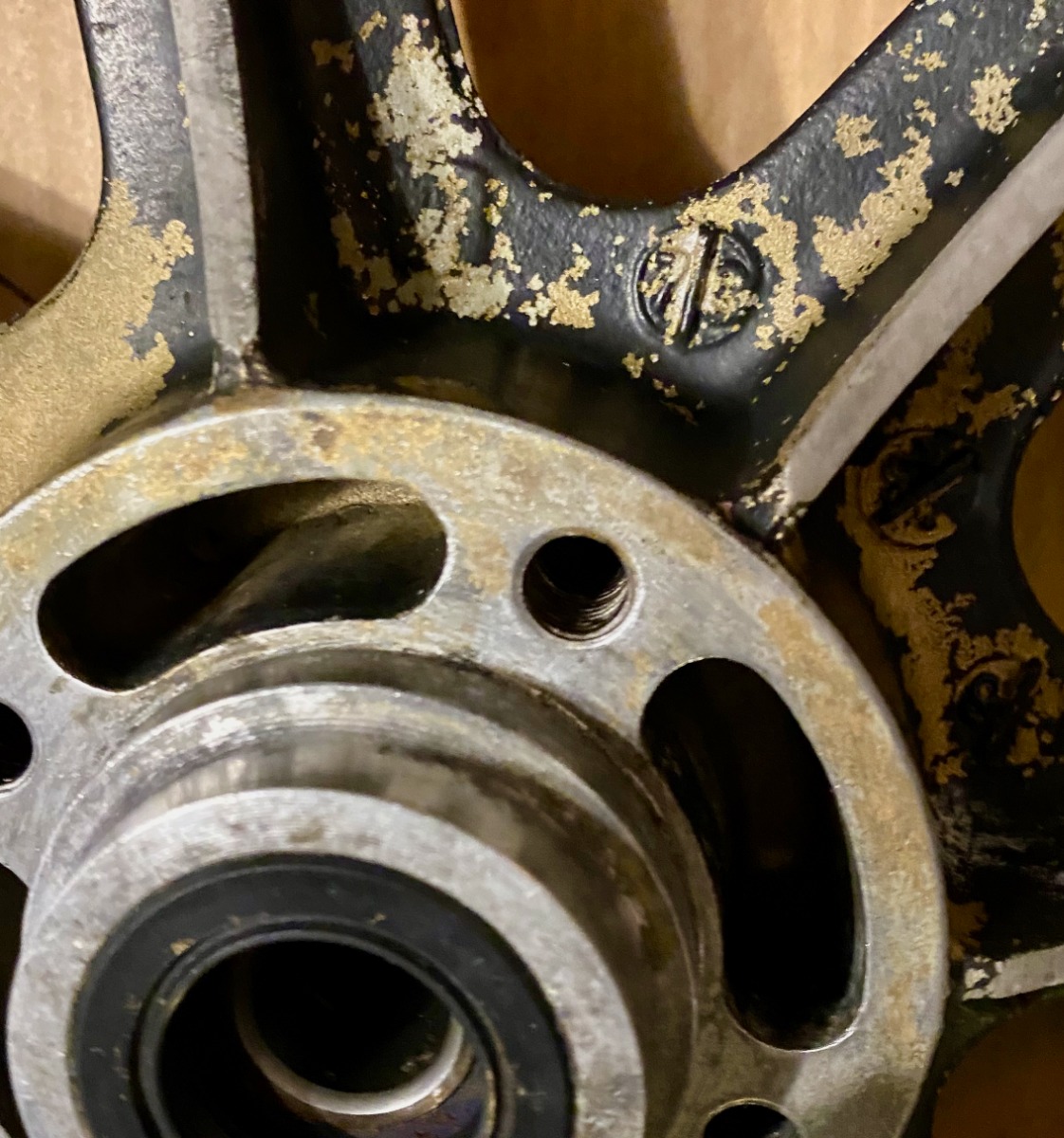 The first thing I noticed was those rotor bolts were not very tight, and tightened unevenly. Definitely someone has been in there. All the bolt threads are good.