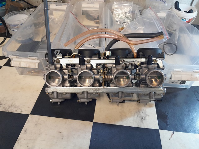 Next up the carbs, with all new o-rings, float needles and that missing throttle needle seat the carbs could go back together. Unfortunately the all new hexcap fasteners that I ordered from China (bags of 50) hadn’t showed up yet as the original JIS m5 screws had been badly mutilated when the PO had removed the bowls with the carbs still on the bike.