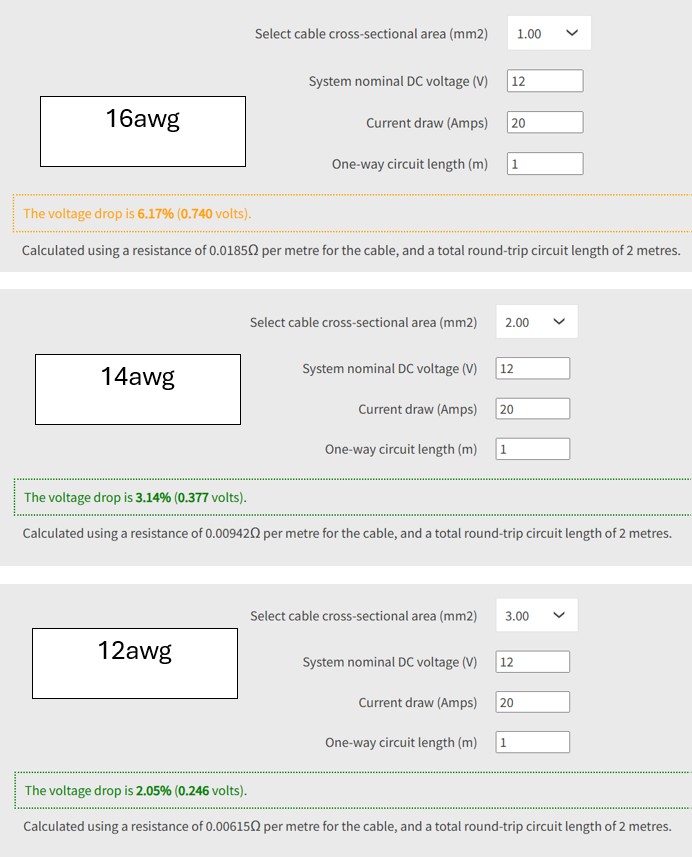 I forgot to ask in the first post. What size wires should I be running from the R/R to the battery? I think I'm running a 14 or 16 gauge. Too small!? 16 is definitely too small, 14 is marginal, I would use 12awg (see below for voltage drops for each size of cable)