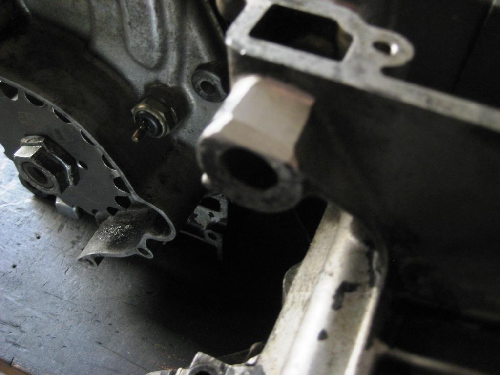 A solid 1018 spacer block was drilled/tapped in both directions to support the clutch side of the cases. A frame bolt goes in from the outside of the frame and the motor mount bolt goes in from the sprocket side thru the weld tab.