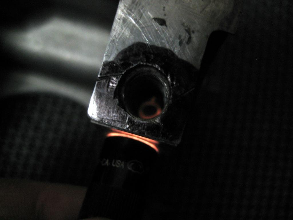 I don't know how this could have happened but that hole has been put oval by drilling on a angle then tapping with a M8? What I see here is baffling!! Whoever did this drilled too deep and ran into the oil galley line that feeds the crank/top end. The drill was angled towards the crank center line. This is not a regular thread repair, probably looking at making a blind threaded insert to seal that oil feed and put that hole back to a straight M8.