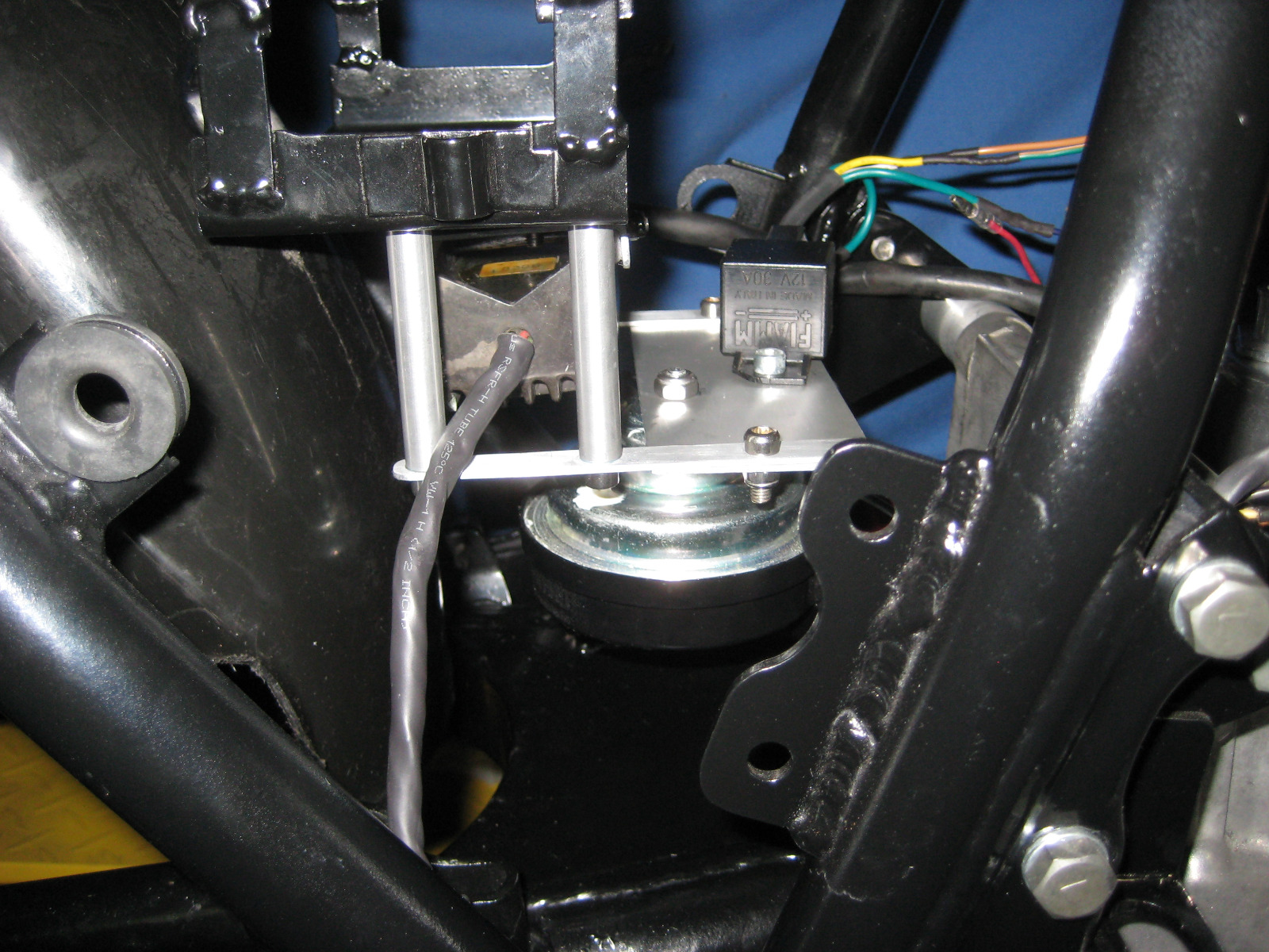I can also run the power wire thru a fuse in the blade fuse box which I omitted when I had it mounted on the 650. Since the horn is closer to the fuse box I shortened the power wire.