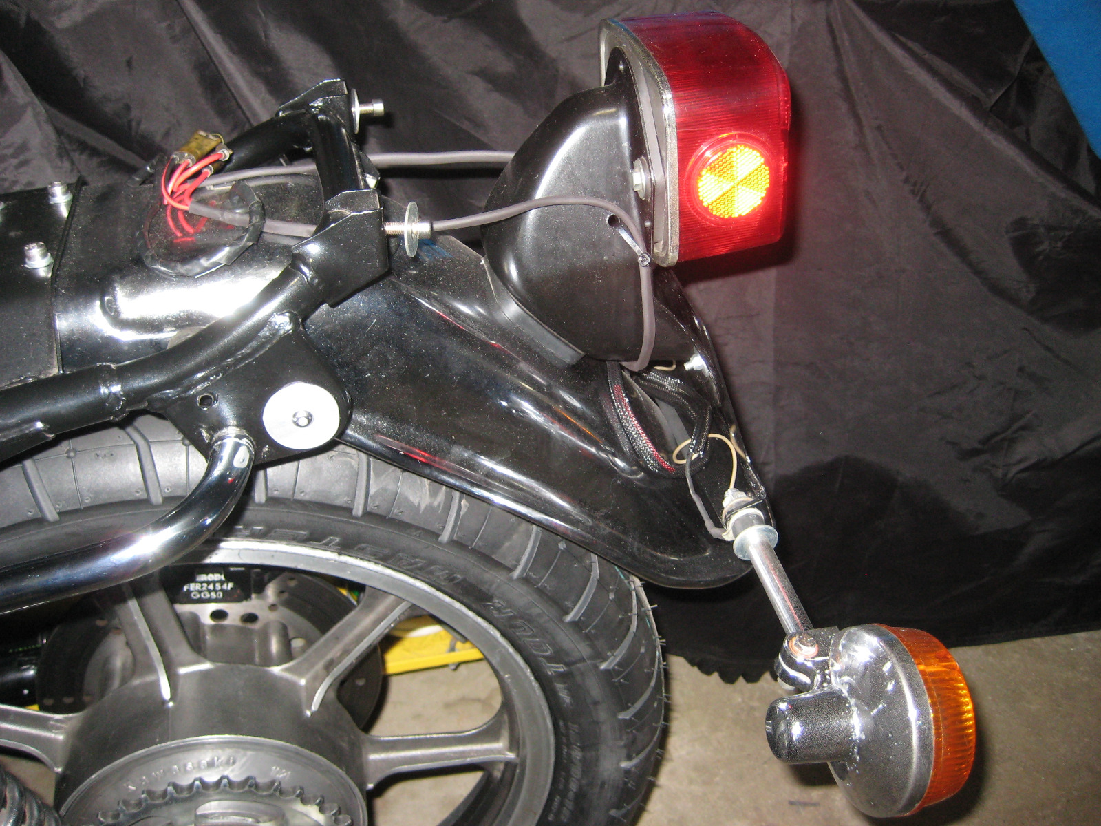 Below are some pics of my modified indicators that I use for soft saddle bags when mounting my luggage rack. They are stock KZ650 indicators I rubber mounted on a custom steel license plate holder. This lower position clears the bags.