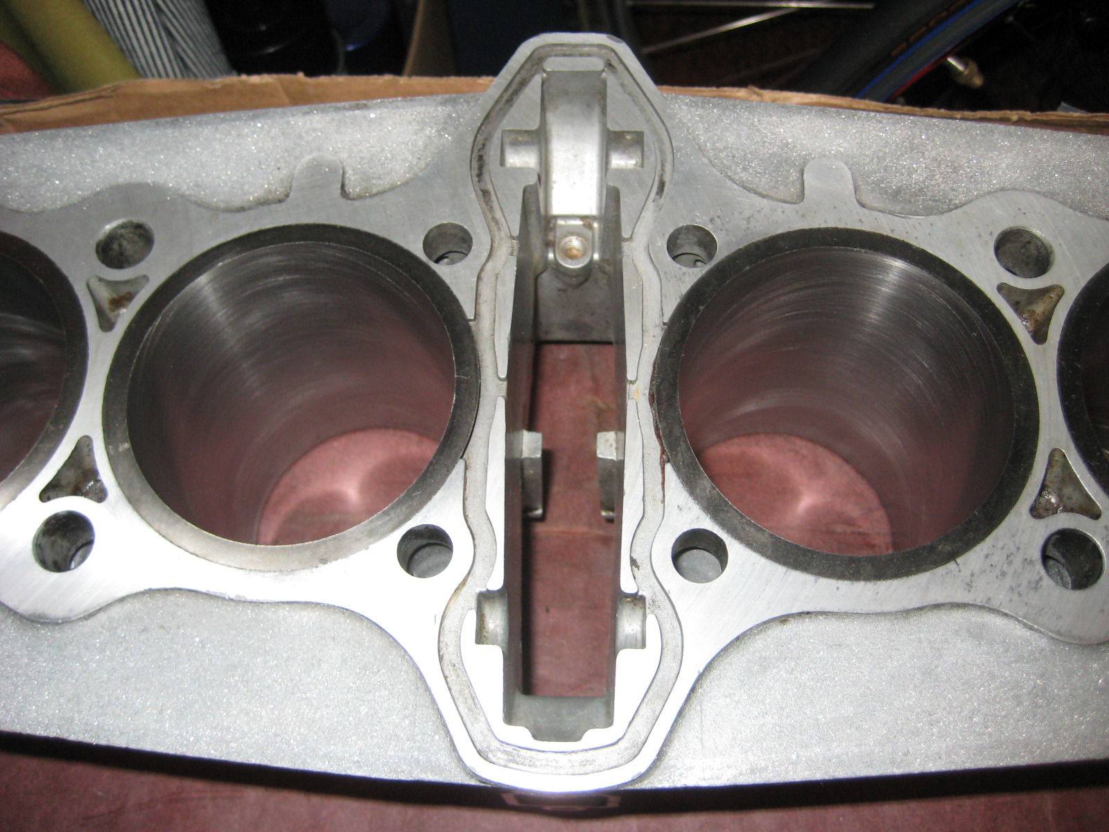 The barrels are bored out so much that there is not much left around those black sound deadening plugs at the base gasket. Apparently that is a potential leak path that requires some RTV on a 1200 build. Some RTV is also required on the top of the barrel in that O ring groove around the cam chain tunnel. That groove will get filled with RTV then cut flush with a razor blade. The stock O ring while fresh sits up way too high and will no longer fit because of the bigger OD liner flanges.