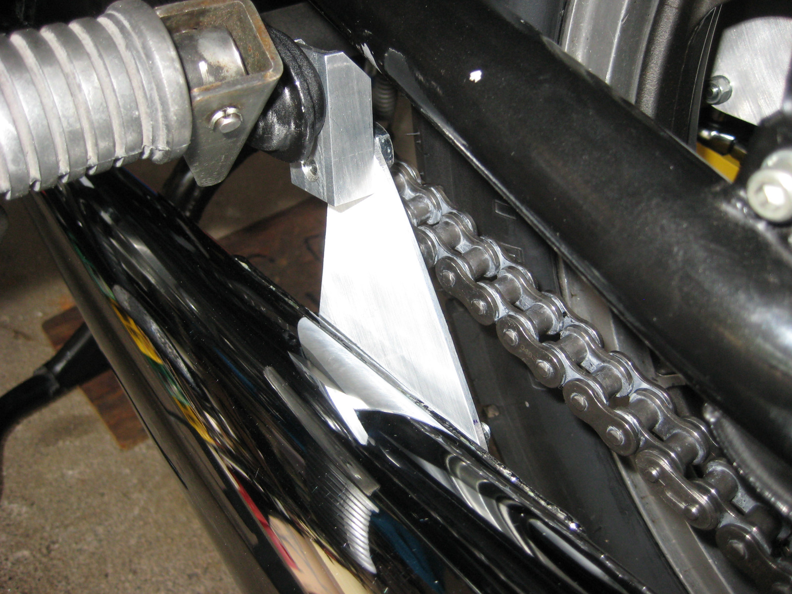 It moved the muffler closer to the tire and it dropped the center down another 1/2", its now within 1/32" of the RH muffler from the floor. The RH muffler is going to be kicked out a bit further with some shims, but I could not adjust it up or down too much because of rear brake lever interference.