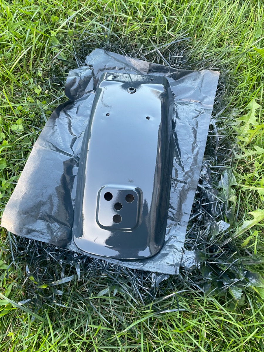 So I’ve gone a slightly different direction on this build. I’m going a cafe racer route with it. I ordered a set of clubman handlebars and bar end mirrors. Was starting to clean up the chrome and realized that it was pealing on the rear fender pretty bad. So I sandblasted it and painted it gloss black. Got to looking at my mufflers and they are literally rotted away on the inside. I might try to find a cheap 4 into 1 for it or figure something out for the mufflers. Was honestly thinking about cutting off the mufflers past the crossover tube and welding on some exhaust turndowns to give it that muscle car side pipe look. Maybe even fab up some baffles to slide in and out. Here is the rear fender.