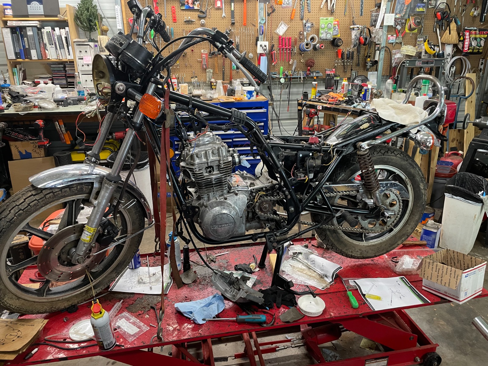 I thought I'd take some pics of the 1979 H-model I'm working on, plus post a few questions...here she is so far; I took it down to the frame, repainted it with Rustoleum Satin Black and did the tank in the same, with a coating of Duplicolor Clear Effex, topped with SprayMax 2K - that stuff is great! It gives a nice hard, clear clearcoat.