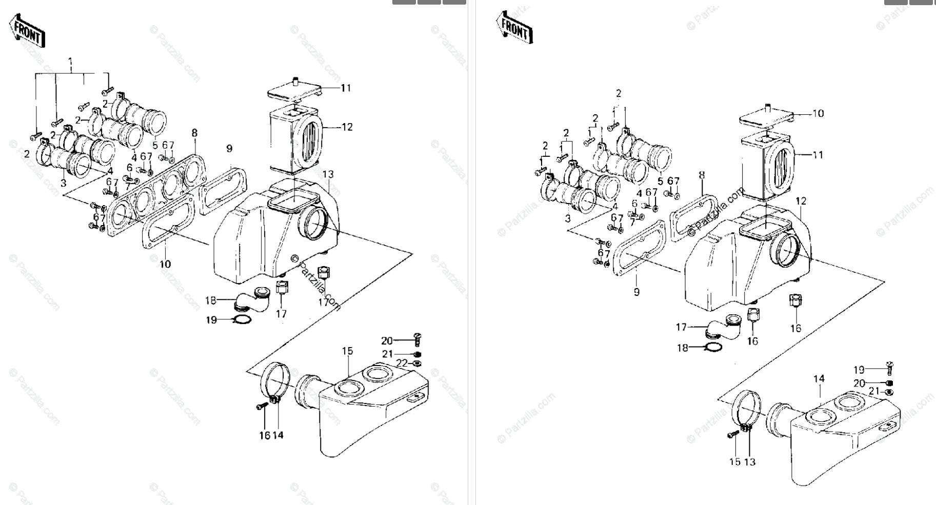 The point being that it could be that airbox 11011-1025 superseded an earlier part number, but is completely compatible with the old one, so Kawasaki just calls out the newer part for the older model. This may be why the '77 KZ1000 shows the old image, but lists the same part number as the '78 diagrams.