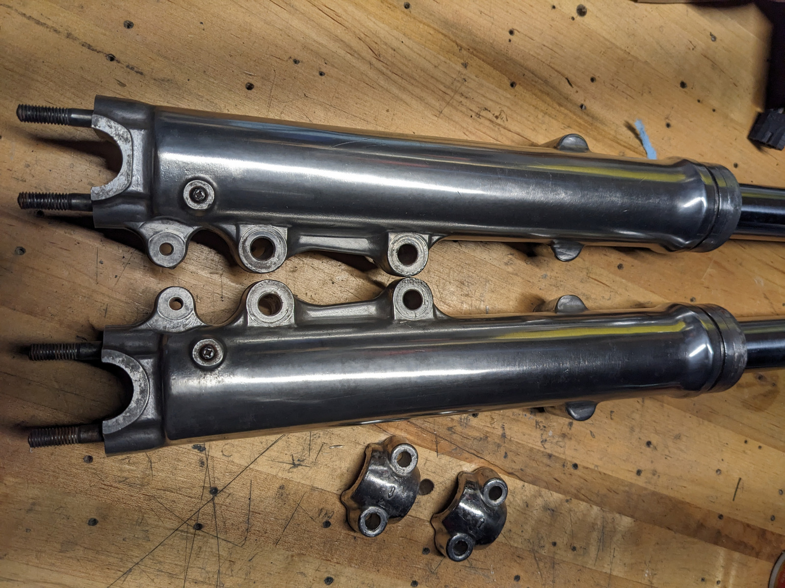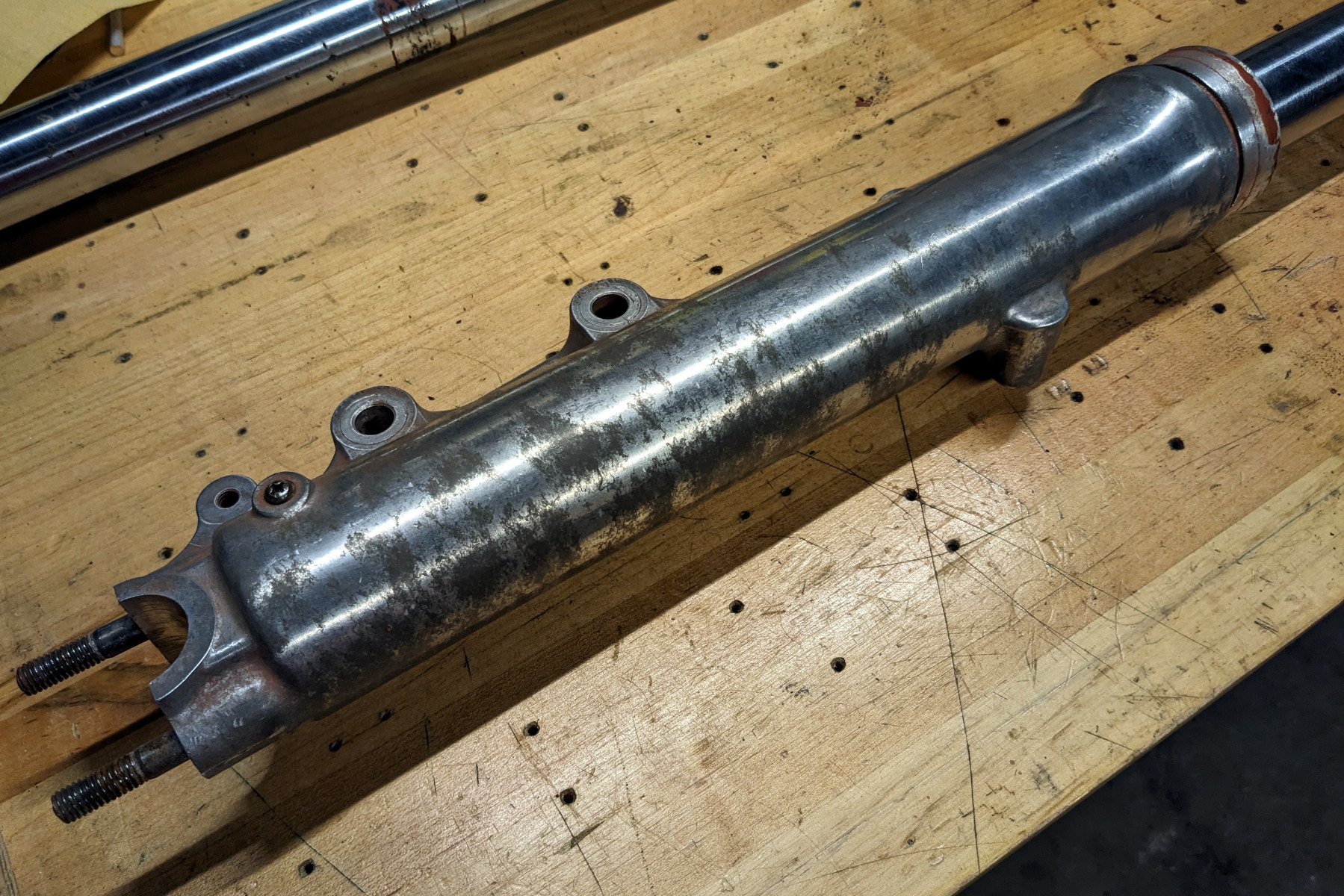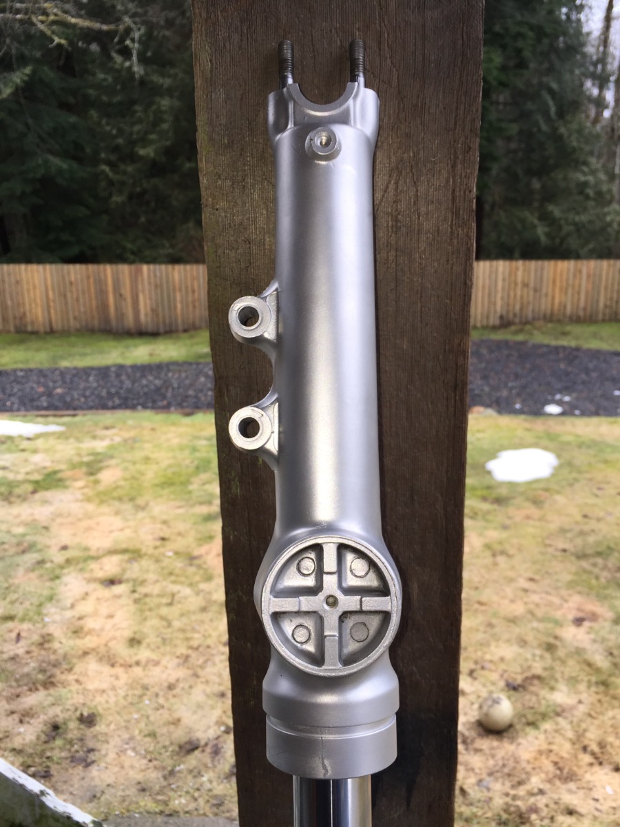 A small bit of progress. The PO painted the fork lowers black. I figured I'd see if I could get the paint off. This took me forever because I tried a lot of things that didn't work that well.