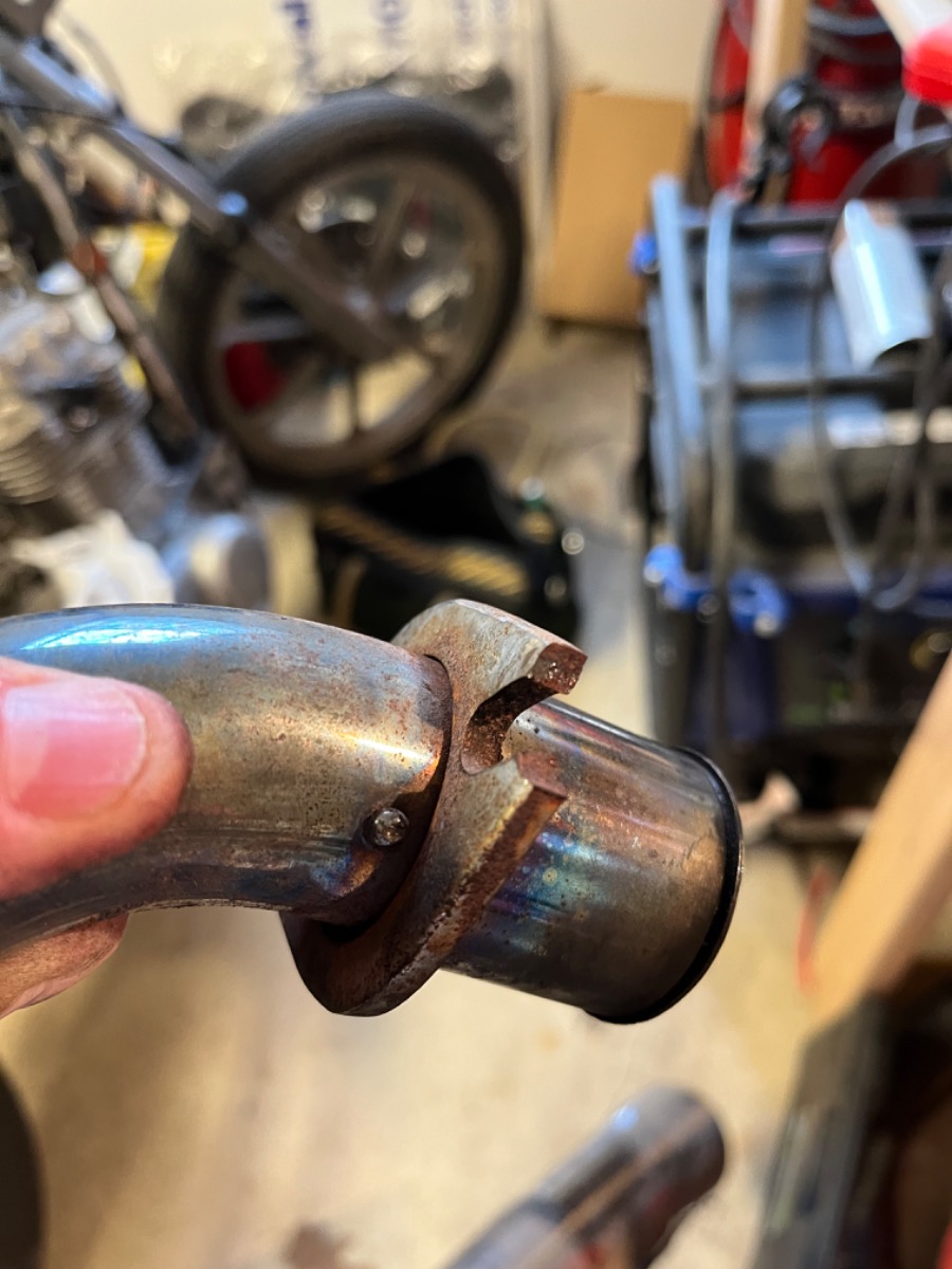 There should be 2 half circle collars that fit against the flare in the tube, and the flanges should be loose on the tubes not welded. See the partzilla diagram for your bike. The factory used the ribbed flanges but a lot of aftermarket pipes use the flat flange like yours has. Both would use the split collars to keep the pipes tight to the head. And there are copper gaskets that go between the pipe and the head to keep a seal.