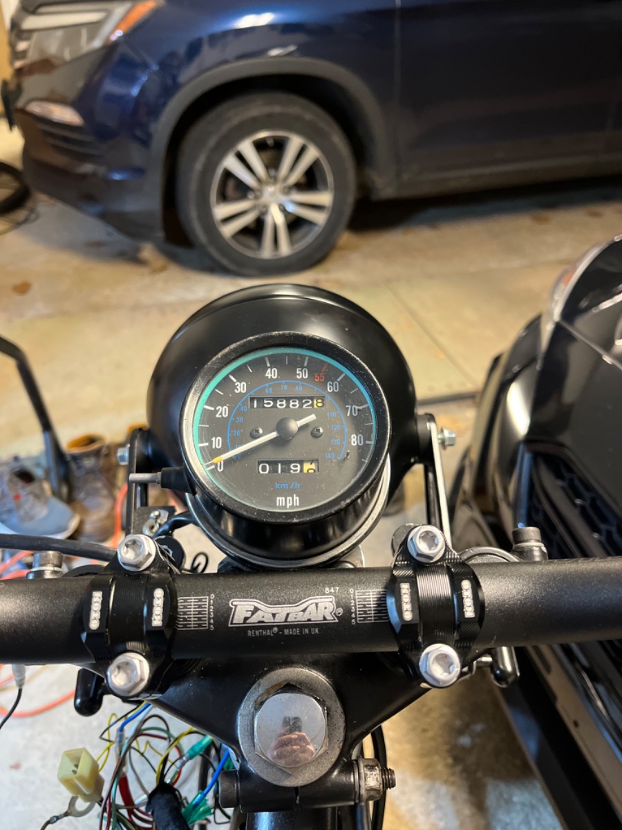 I hope to get a more thorough test in next week after getting my plates and having my neighbor follow along as an extra set of eyes and ears. Assuming that goes well I can start thinking about next steps. The fenders are not in great shape so I most likely will repaint them, and the tank needs stripped and painted as well. There is only one small ding at the very front. The wiring needs to be tucked up under the tank, and maybe get a replacement ignition switch. I like the mini toggle, but not very secure. Also, the old switch gear is pretty beat up and very chunky. I might try something aftermarket that is not too pricey. I also have a few cosmetics pieces found on EBay to repair the PO hacking up the gauge mounts. (no idea what he was thinking…)