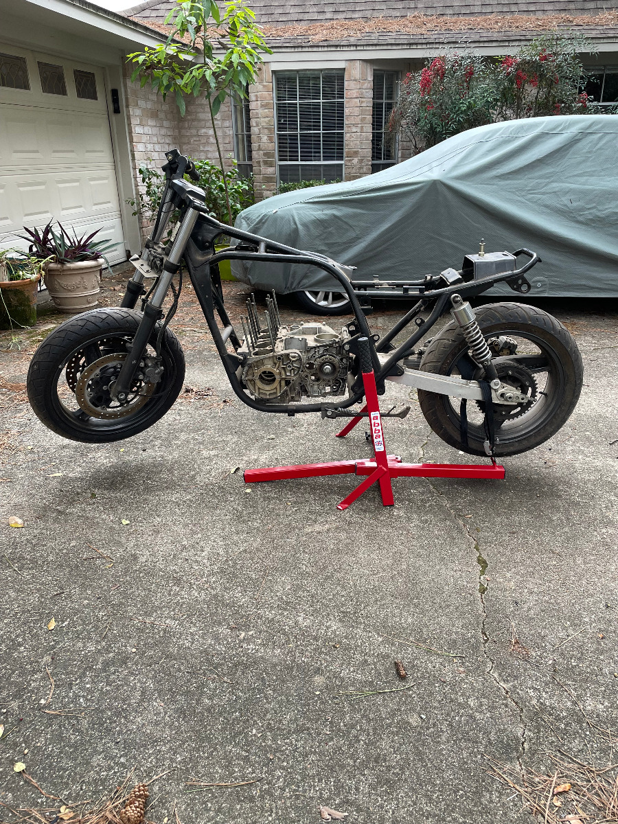 I am sure some of you wise guys are thinking, well, with that wider rear wheel and the 530 rear sprocket, sumpin aint gonna work so well at the output shaft end of things. If you look closely in the last picture, you may see a front sprocket from and early 1100 Ninja that seems to solve the chain pitch and offset difficulties.