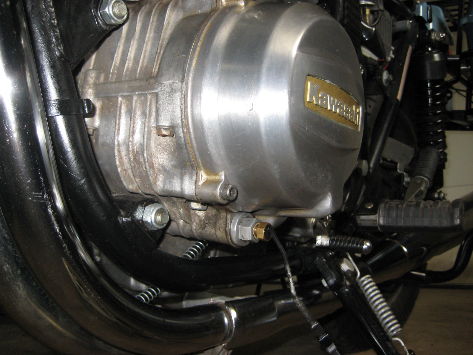 The engine runs a little hot, so I added a small oil cooler last Summer using a modified KZ650 oil pan. The mounting was a issue due to the fairing, running lights, and dual horns.