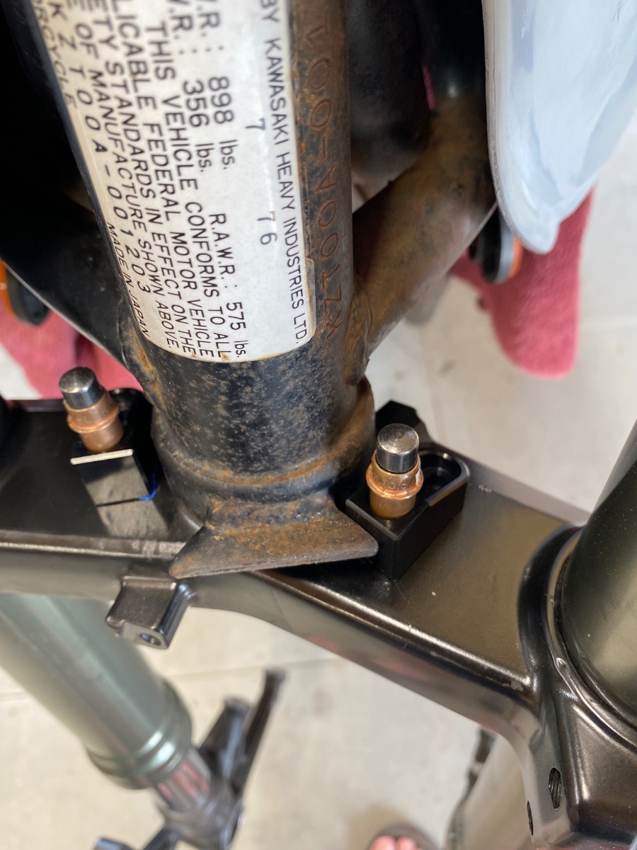 =19.5pxHey all. Been away from the shed for a while but I did get new triple clamps and steering stops from Cognito moto. Fit and look great. Have to final drill and tap the holes for the stops. Next I’m going to get an offset c/s sprocket and get the rear carrier machined for chain alignment. We’ll see how that goes.