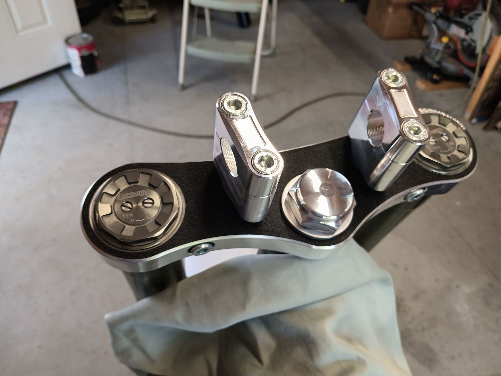 I thought I'd post some pics of my new seat, bike standing with shoes on and the new top clamp I tarted up a bit with some wrinkle paint. If anyone knows where to get some old school bend superbike bars, let me know. That will be next.