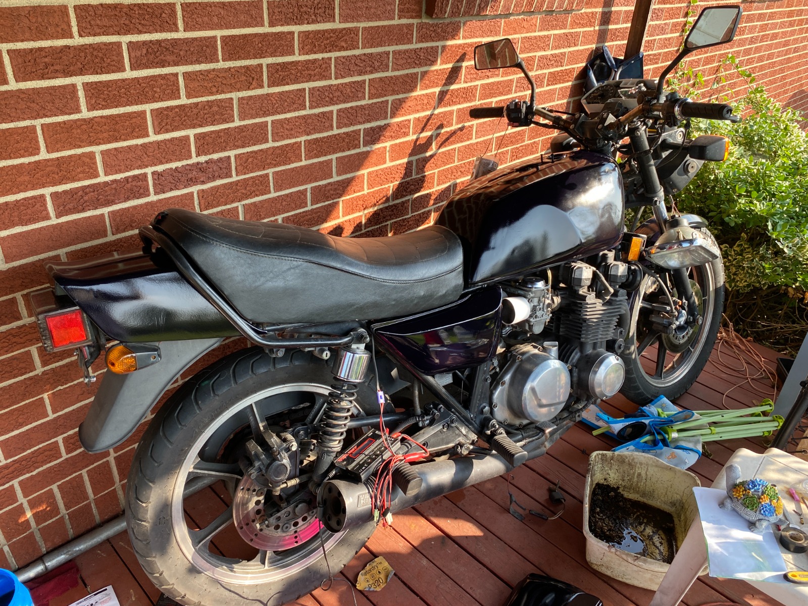 1978 KZ650 C2, 130K kms, Delkevic ex, EI, CVK32, PMC easy clutch, ATK fork brace, steering damper, braced swingarm, ZRX shocks, 18" Z1R front wheel.