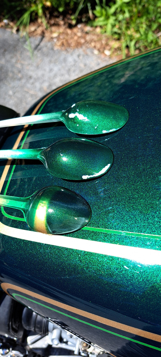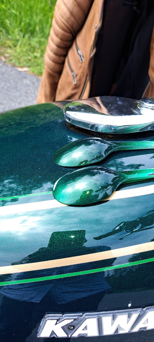 The plastic spoons in the picture is from when trying to mix paint to match the original paint on the gastank. I mixed 3 different colors from spraycans ,but it does not look like same color so i will send it to a professional painter.